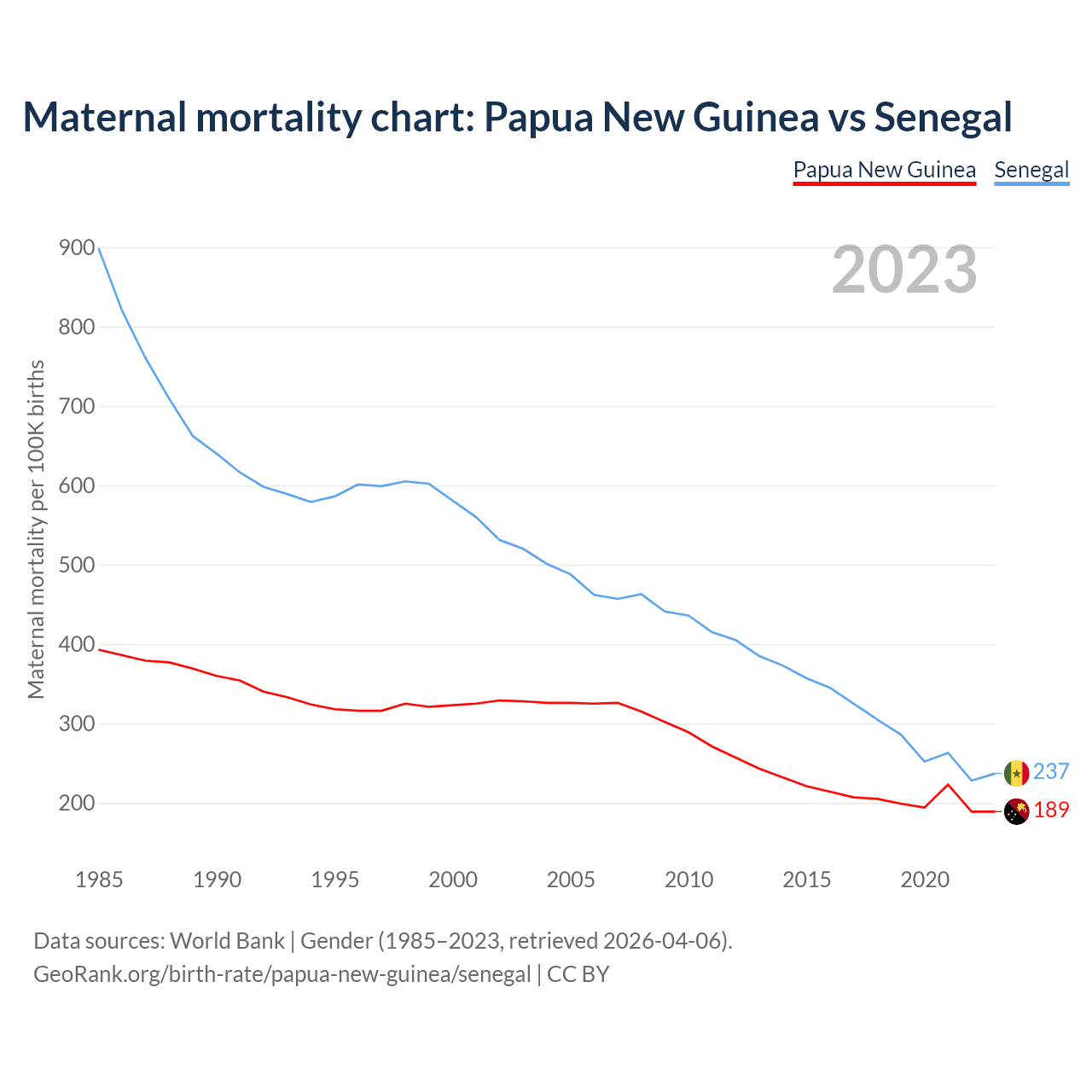 The maternal mortality rate, which is the probability of dying during childbirth or within 42 days of pregnancy termination, is 189 deaths per 100,000 live births in Papua New Guinea, compared to 237 deaths in Senegal.