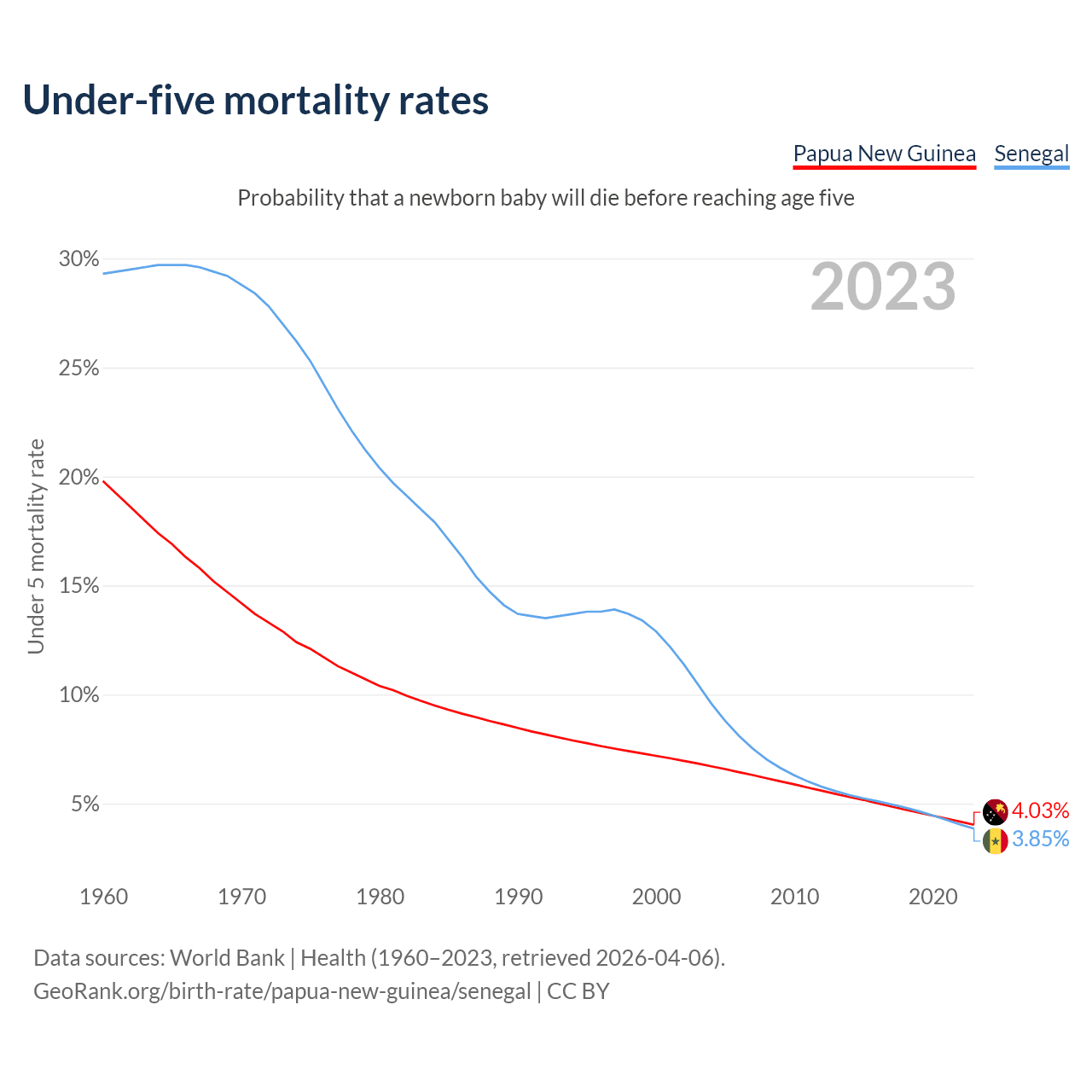 The chance that a newborn baby will die before reaching age five is 4.03% in Papua New Guinea and 3.85% in Senegal. Above is a chart with historical data on under-five mortality rates.