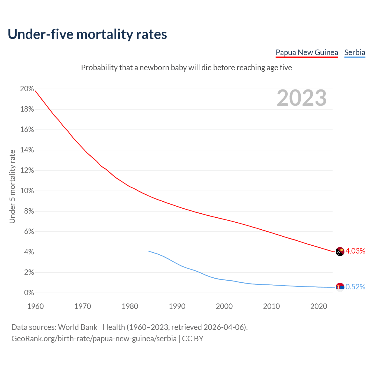 The chance that a newborn baby will die before reaching age five is 4.03% in Papua New Guinea and 0.52% in Serbia. Above is a chart with historical data on under-five mortality rates.