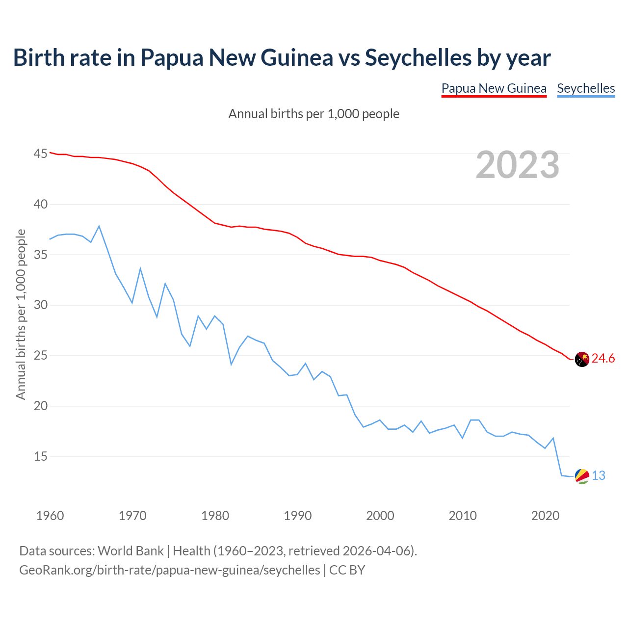 Papua New Guinea has an annual birth rate of 24.6 births per 1,000 people, compared to 13 for the Seychelles. The average number of children a woman is expected to have during her lifetime — the fertility rate, is 3.1 in Papua New Guinea and 2.02 in the Seychelles — 34.8% difference.