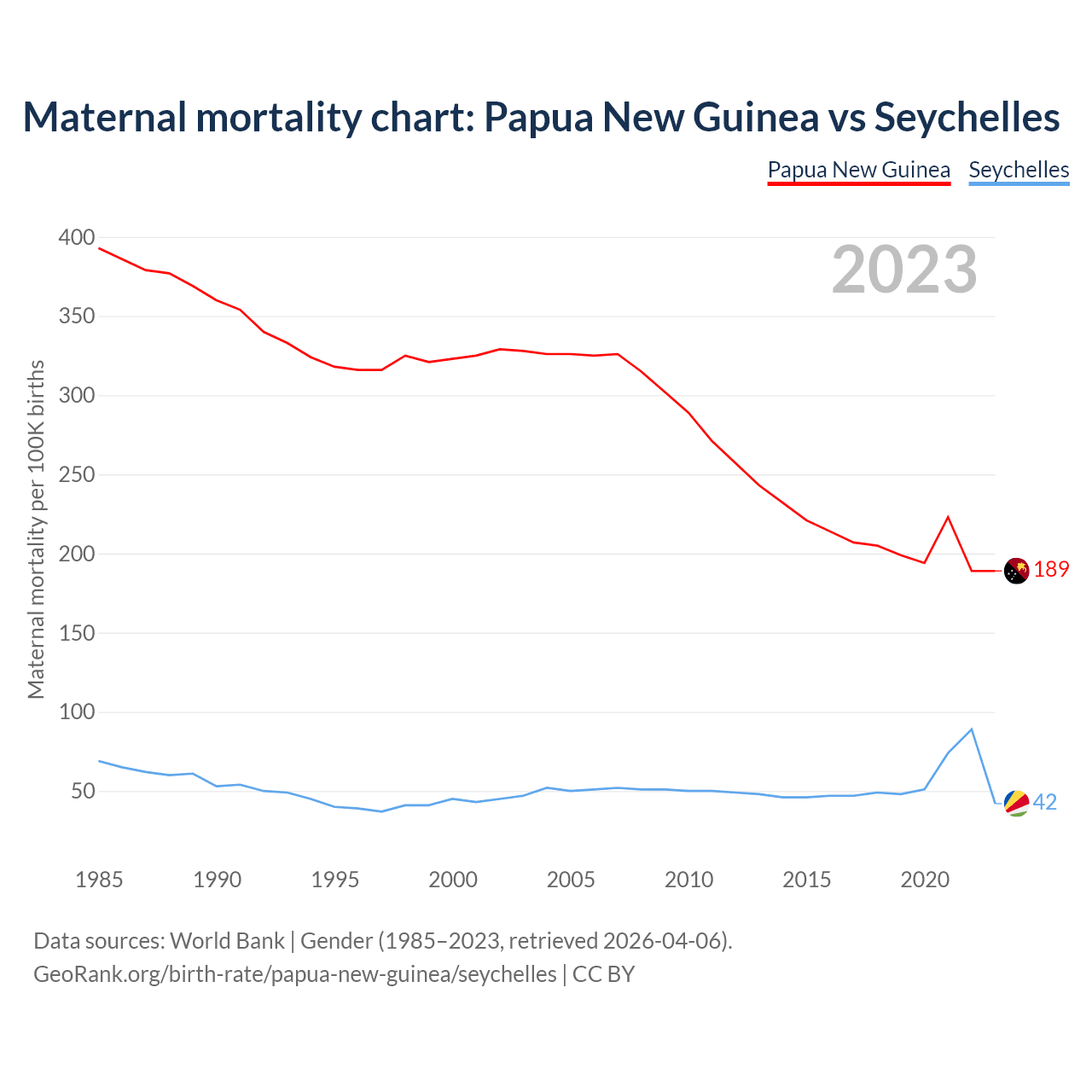 - Annual births per 1,000 women ages 15-19 (adolescent birth rate or teenage mother rate) is 54.1 in Papua New Guinea vs 54.5 in the Seychelles.
