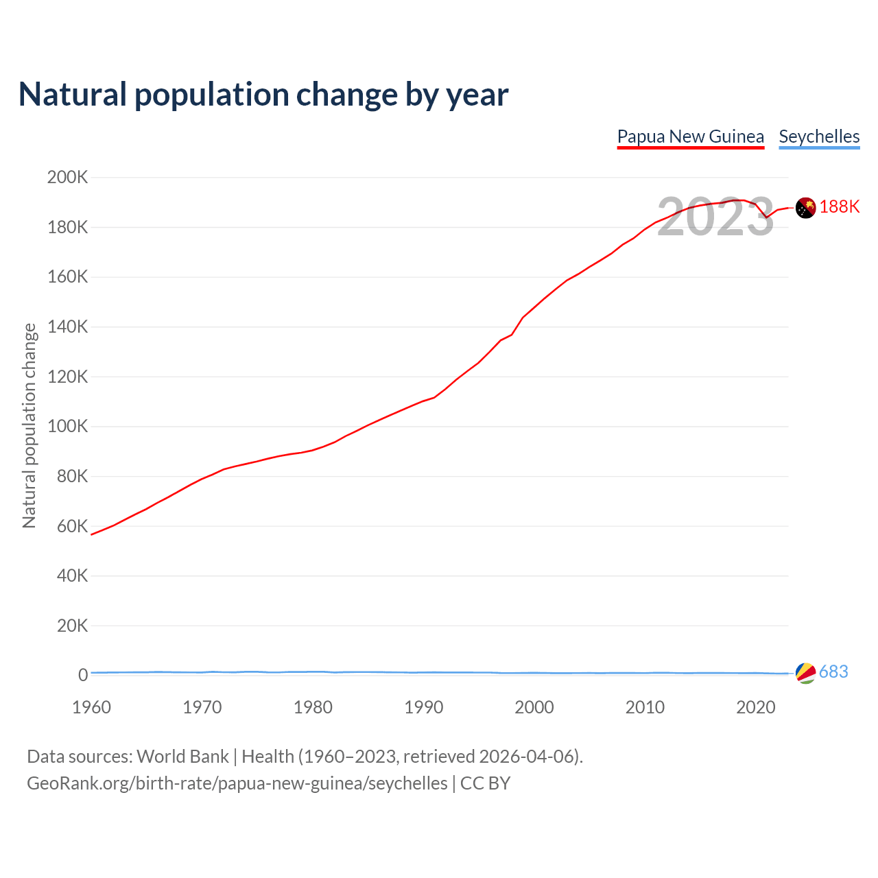 According to the latest available data on birth rates, the fertility rate in Papua New Guinea was 3.1 children per woman in 2023, compared to 2.02 in the Seychelles in 2023. The replacement level is considered to be 2.1 children per woman.