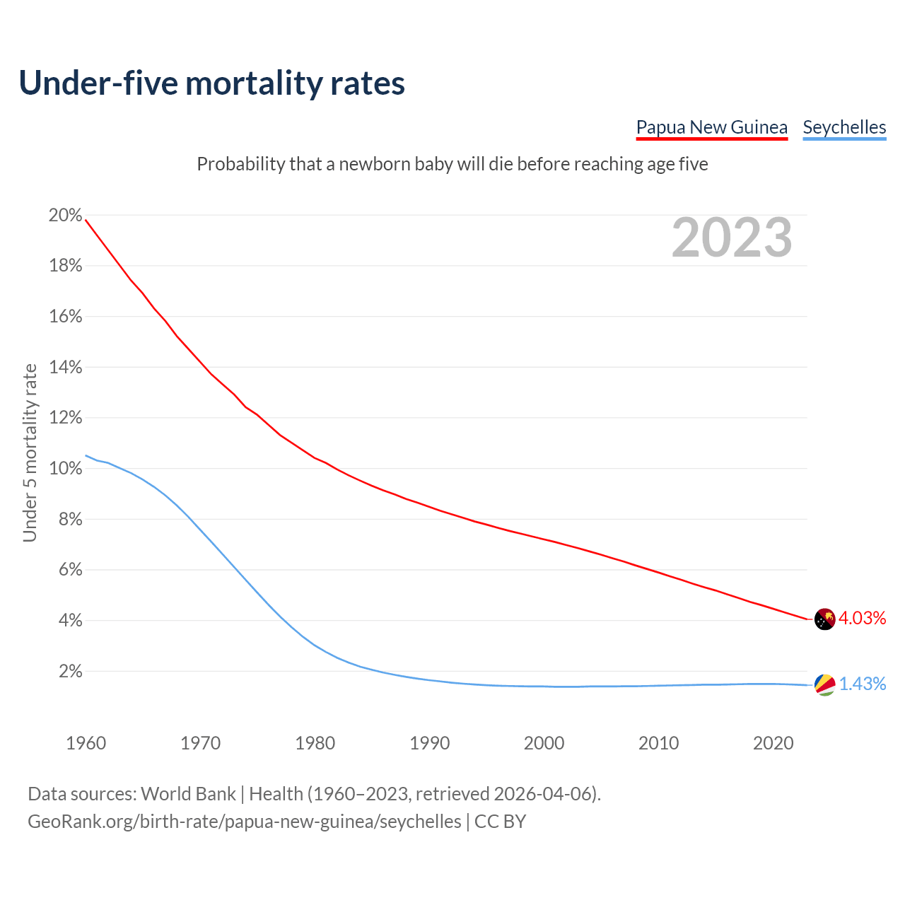 The chance that a newborn baby will die before reaching age five is 4.03% in Papua New Guinea and 1.43% in the Seychelles. Above is a chart with historical data on under-five mortality rates.