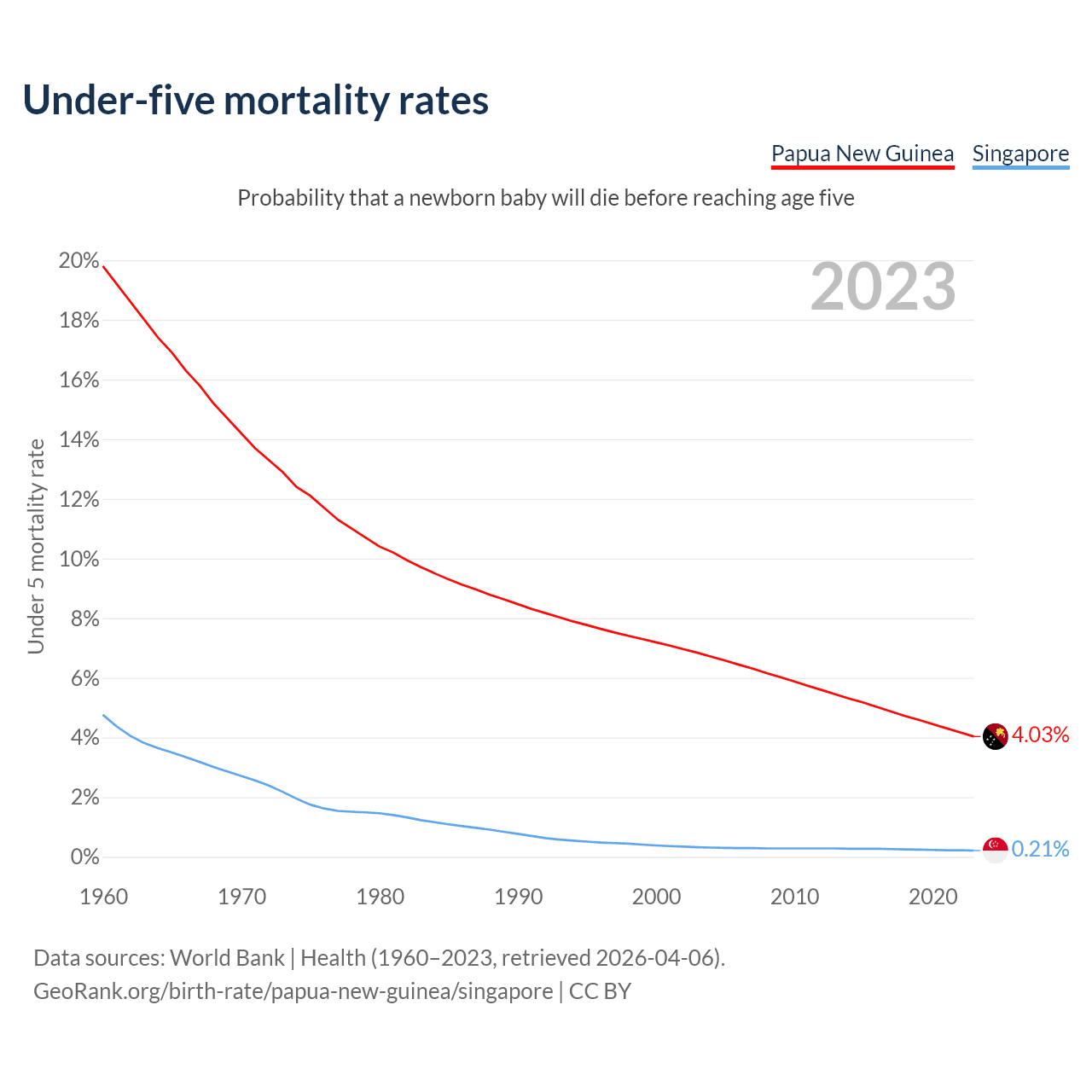 The chance that a newborn baby will die before reaching age five is 4.03% in Papua New Guinea and 0.21% in Singapore. Above is a chart with historical data on under-five mortality rates.