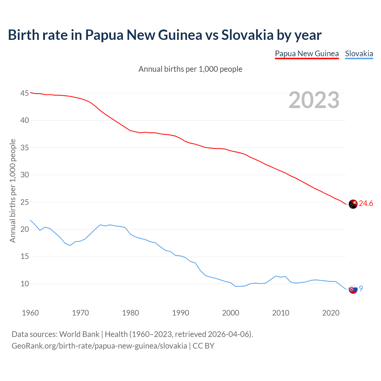 Papua New Guinea has an annual birth rate of 24.6 births per 1,000 people, compared to 9 for Slovakia. The average number of children a woman is expected to have during her lifetime — the fertility rate, is 3.1 in Papua New Guinea and 1.49 in Slovakia — 51.9% difference.