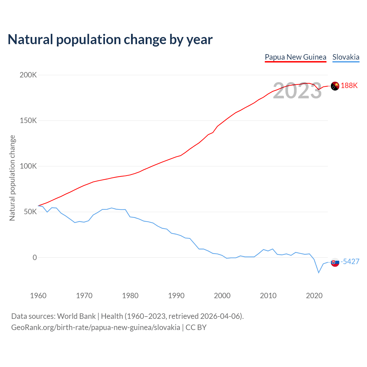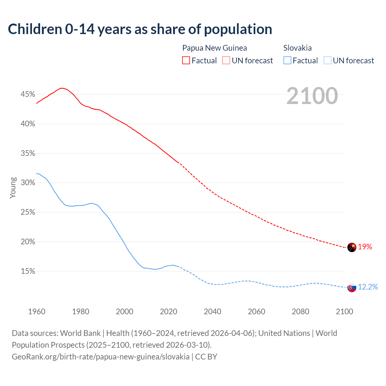 According to the latest available data on birth rates, the fertility rate in Papua New Guinea was 3.1 children per woman in 2023, compared to 1.49 in Slovakia in 2023. The replacement level is considered to be 2.1 children per woman.