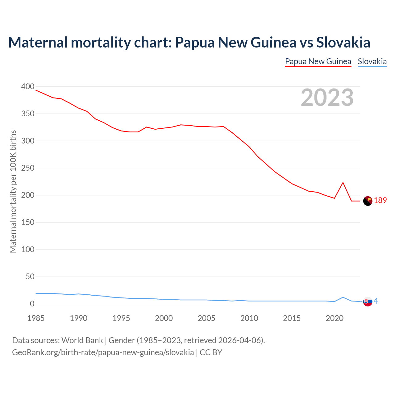 The maternal mortality rate, which is the probability of dying during childbirth or within 42 days of pregnancy termination, is 189 deaths per 100,000 live births in Papua New Guinea, compared to 4 deaths in Slovakia.
