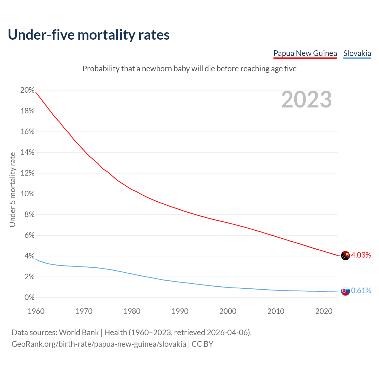The chance that a newborn baby will die before reaching age five is 4.03% in Papua New Guinea and 0.61% in Slovakia. Above is a chart with historical data on under-five mortality rates.