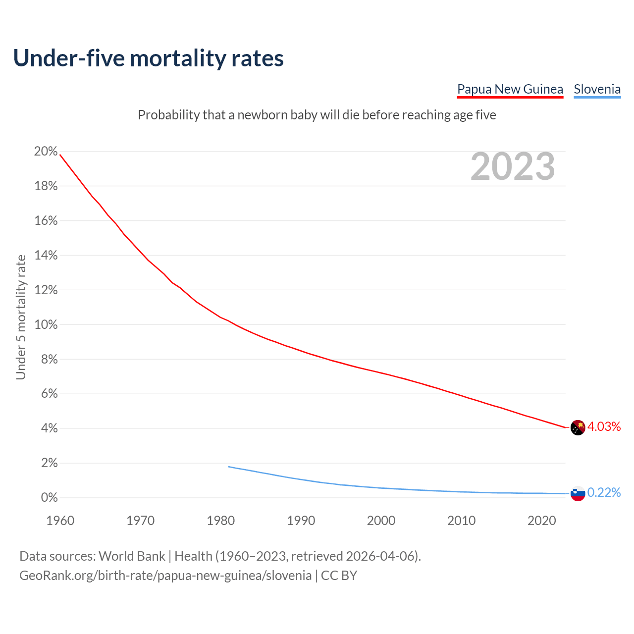 The chance that a newborn baby will die before reaching age five is 4.03% in Papua New Guinea and 0.22% in Slovenia. Above is a chart with historical data on under-five mortality rates.