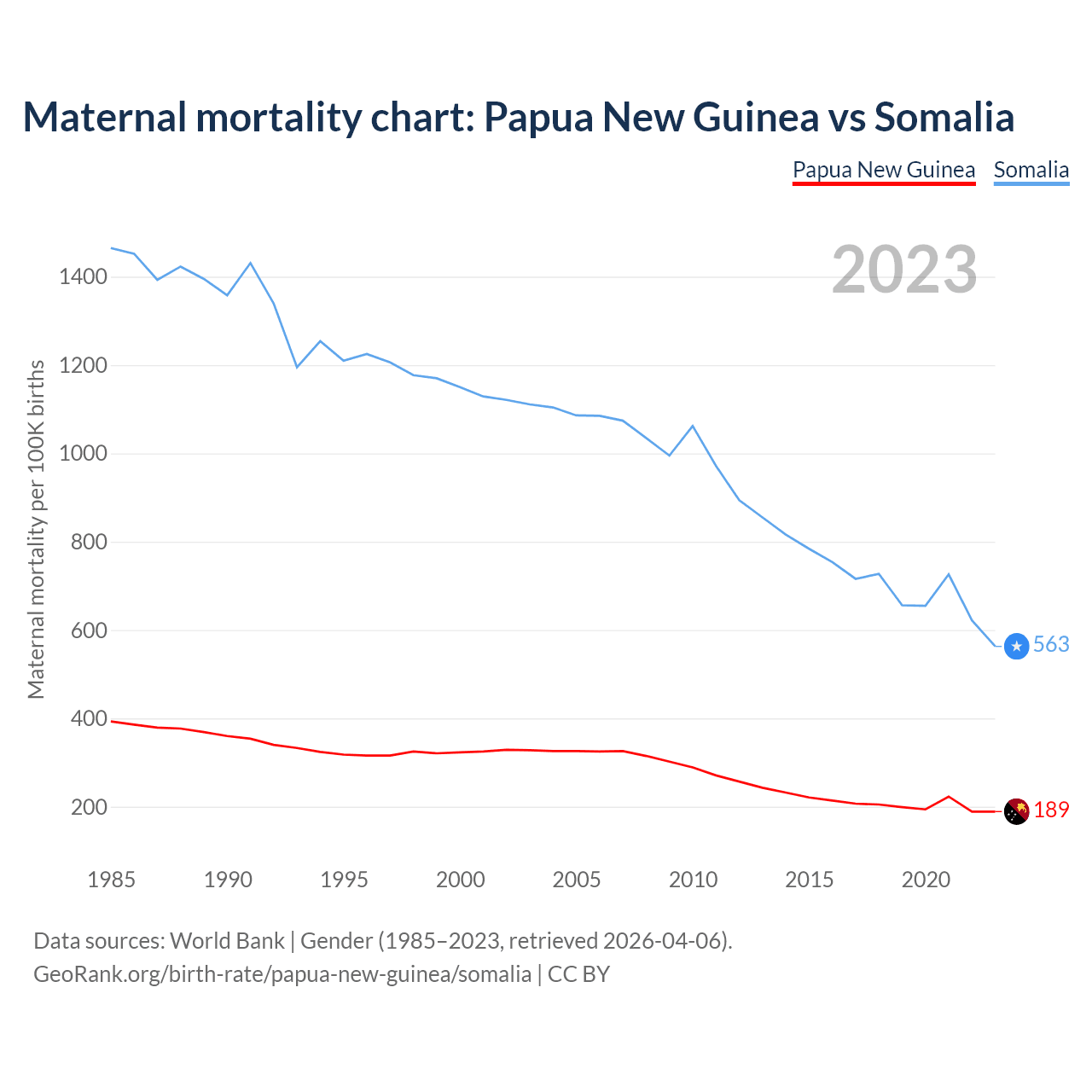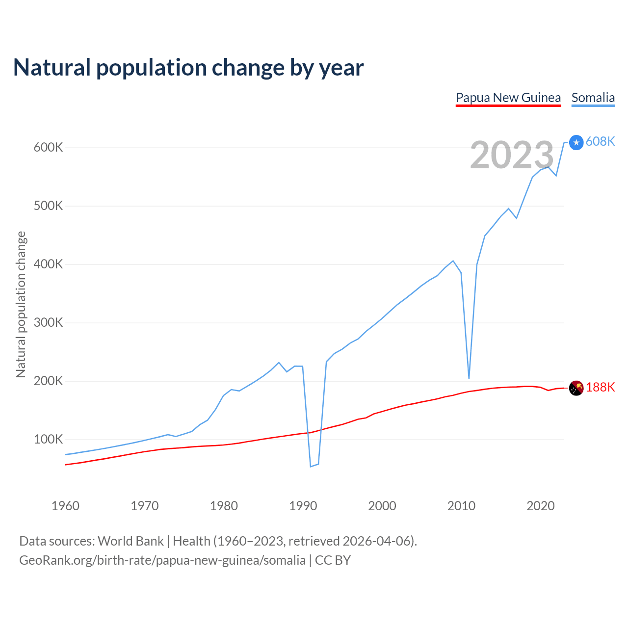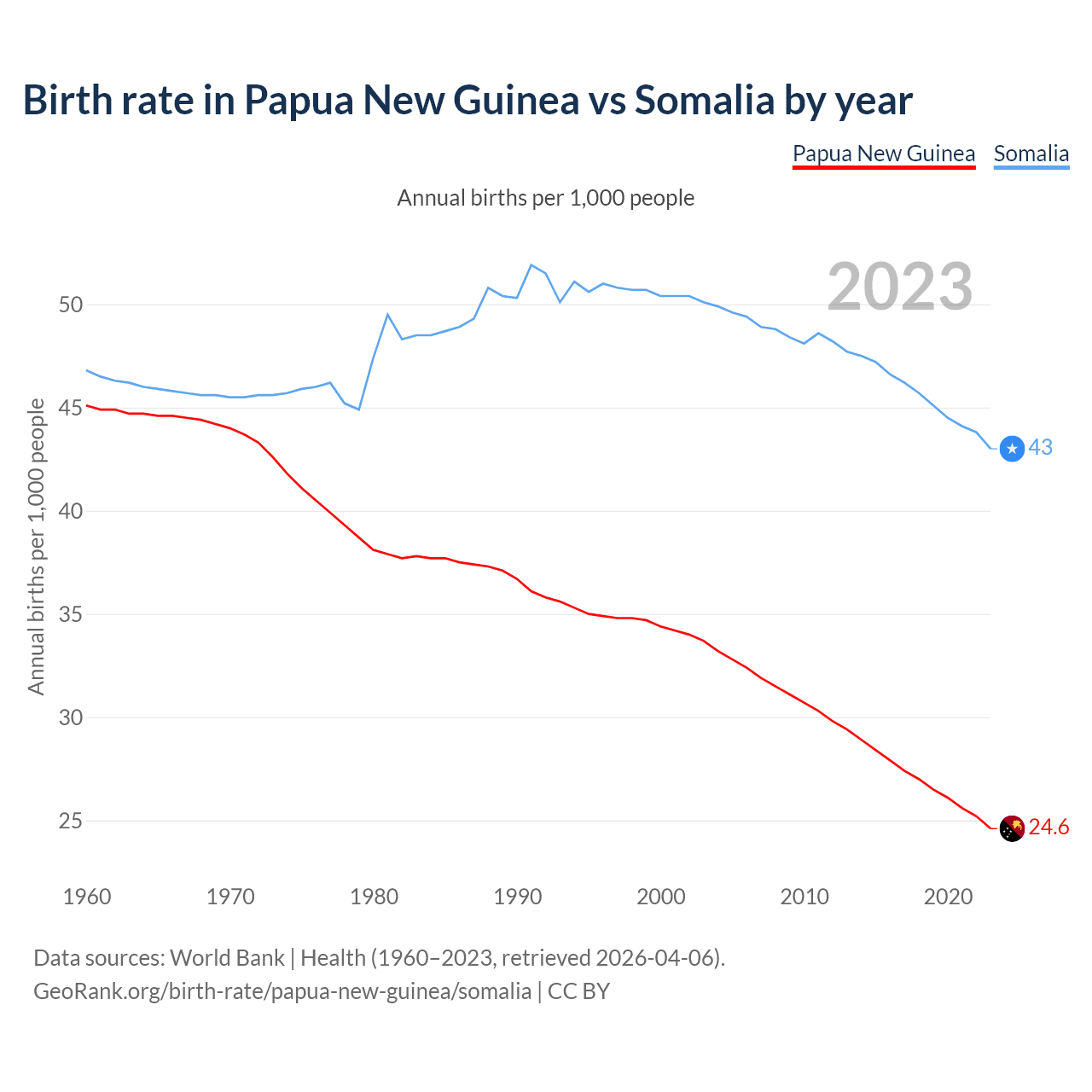 Papua New Guinea has an annual birth rate of 24.6 births per 1,000 people, compared to 43 for Somalia. The average number of children a woman is expected to have during her lifetime — the fertility rate, is 3.1 in Papua New Guinea and 6.13 in Somalia — 97.9% difference.