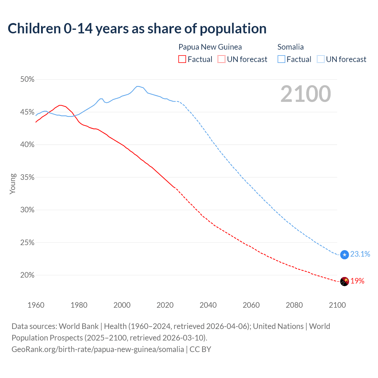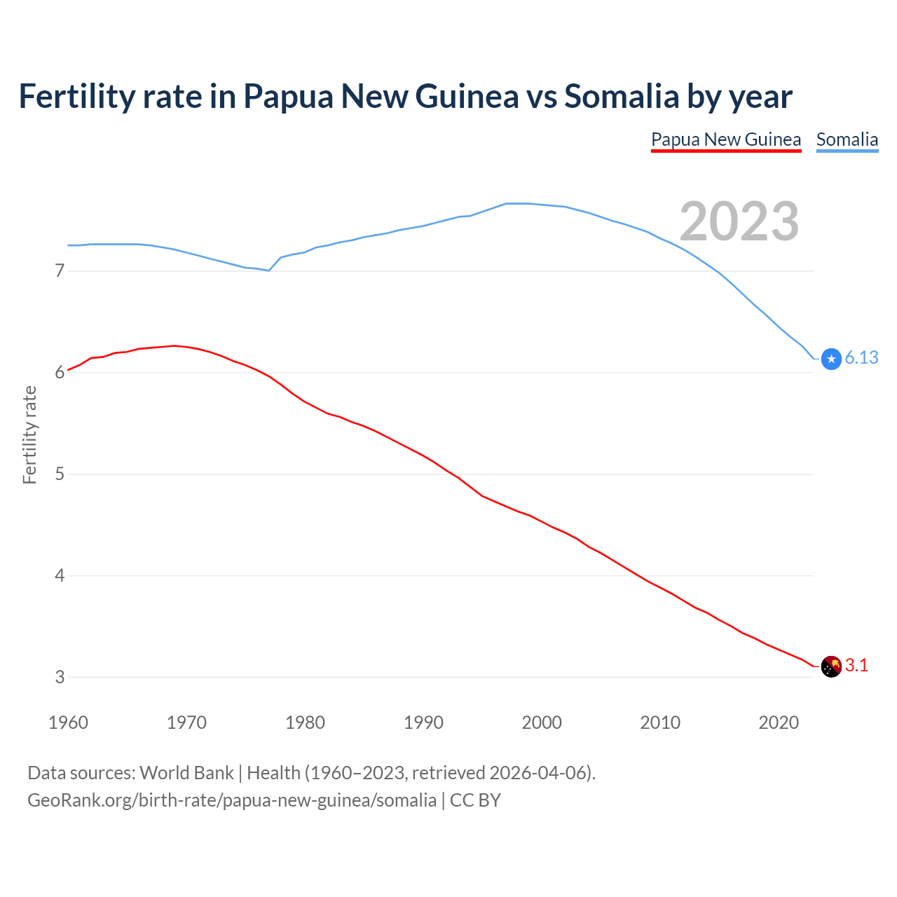 According to the latest available data on birth rates, the fertility rate in Papua New Guinea was 3.1 children per woman in 2023, compared to 6.13 in Somalia in 2023. The replacement level is considered to be 2.1 children per woman.
