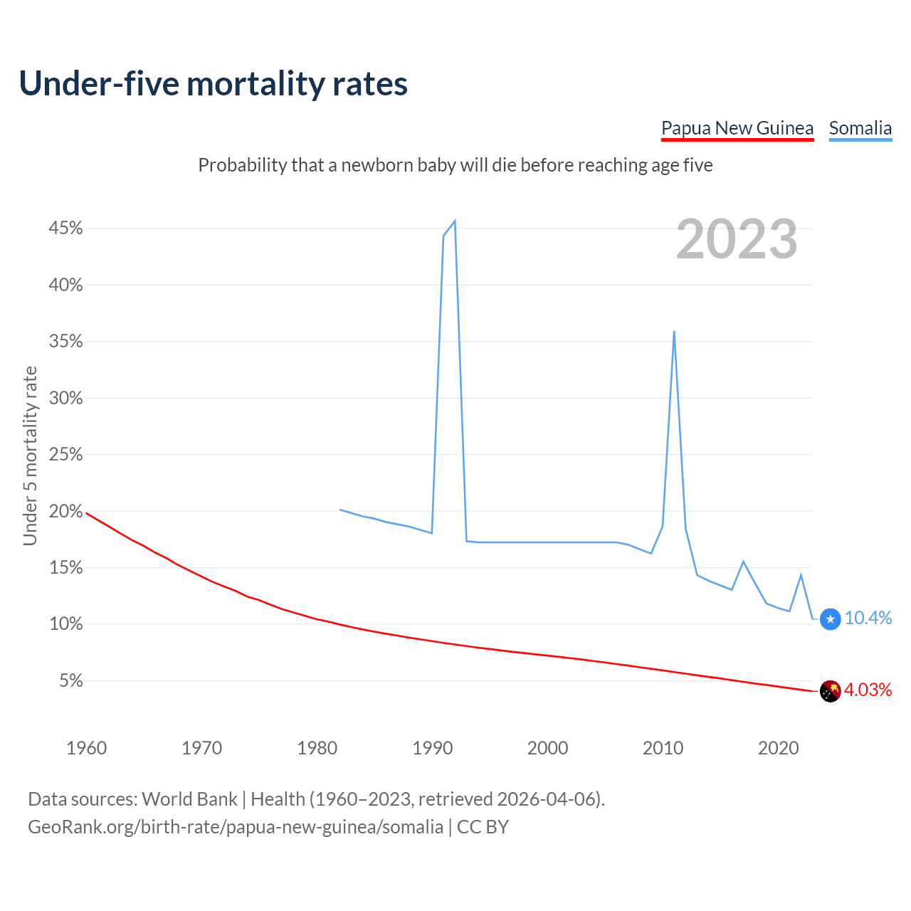 The chance that a newborn baby will die before reaching age five is 4.03% in Papua New Guinea and 10.4% in Somalia. Above is a chart with historical data on under-five mortality rates.