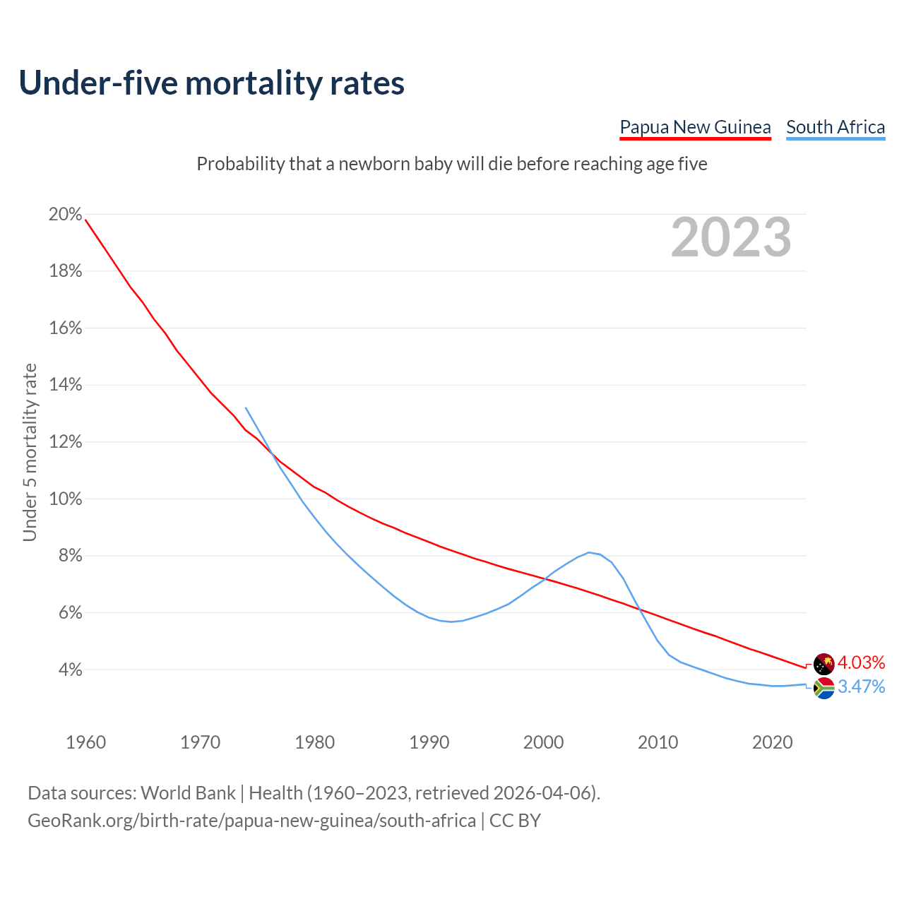 The chance that a newborn baby will die before reaching age five is 4.03% in Papua New Guinea and 3.47% in South Africa. Above is a chart with historical data on under-five mortality rates.