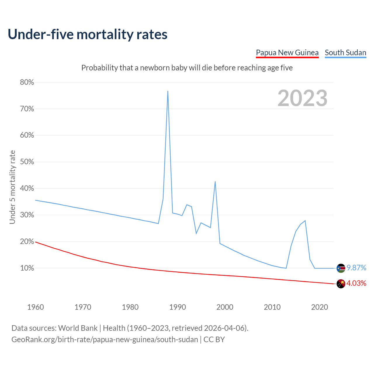 The chance that a newborn baby will die before reaching age five is 4.03% in Papua New Guinea and 9.87% in South Sudan. Above is a chart with historical data on under-five mortality rates.