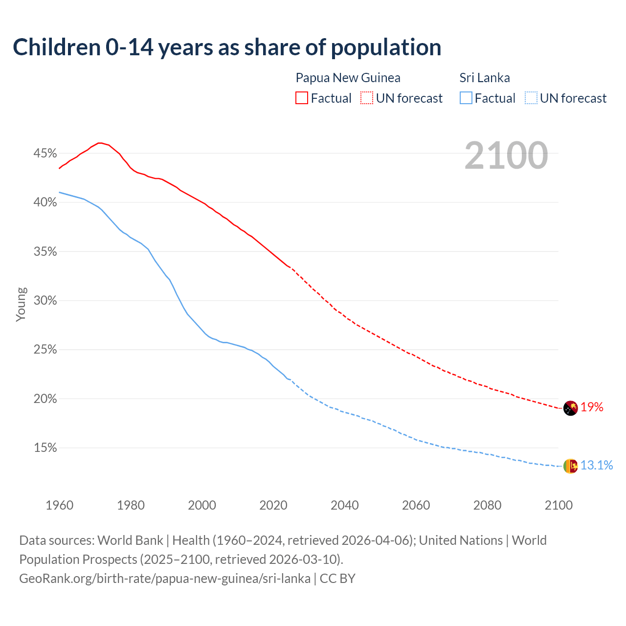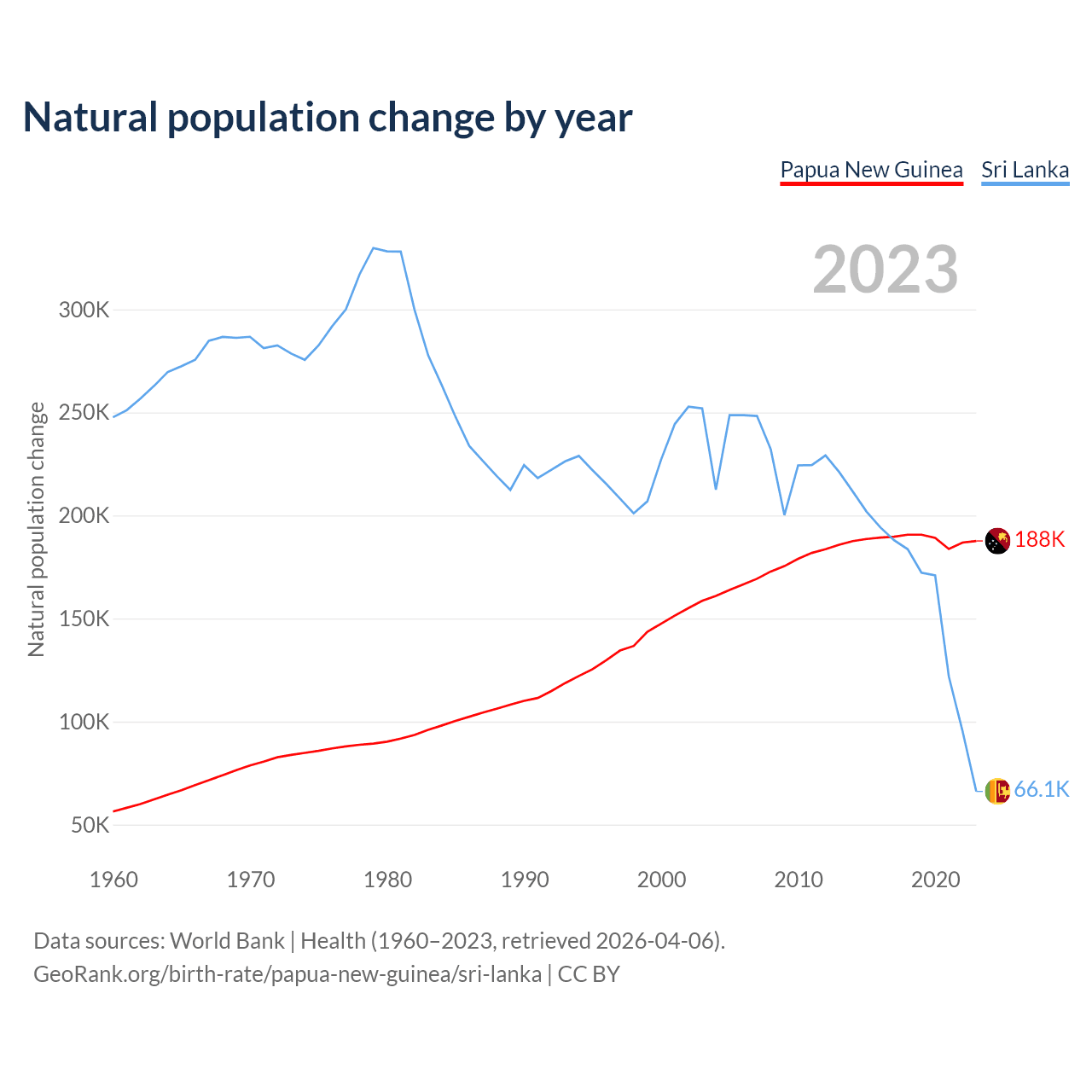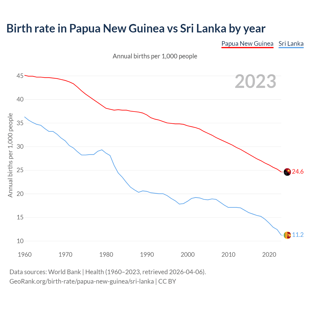 According to the latest available data on birth rates, the fertility rate in Papua New Guinea was 3.1 children per woman in 2023, compared to 1.97 in Sri Lanka in 2023. The replacement level is considered to be 2.1 children per woman.