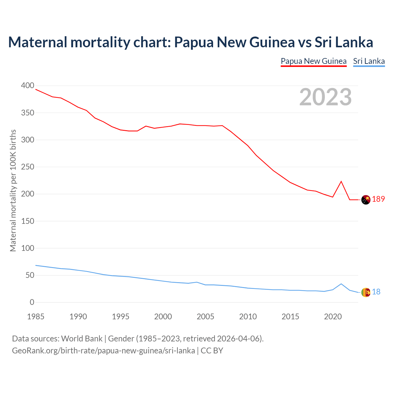 The maternal mortality rate, which is the probability of dying during childbirth or within 42 days of pregnancy termination, is 189 deaths per 100,000 live births in Papua New Guinea, compared to 18 deaths in Sri Lanka.