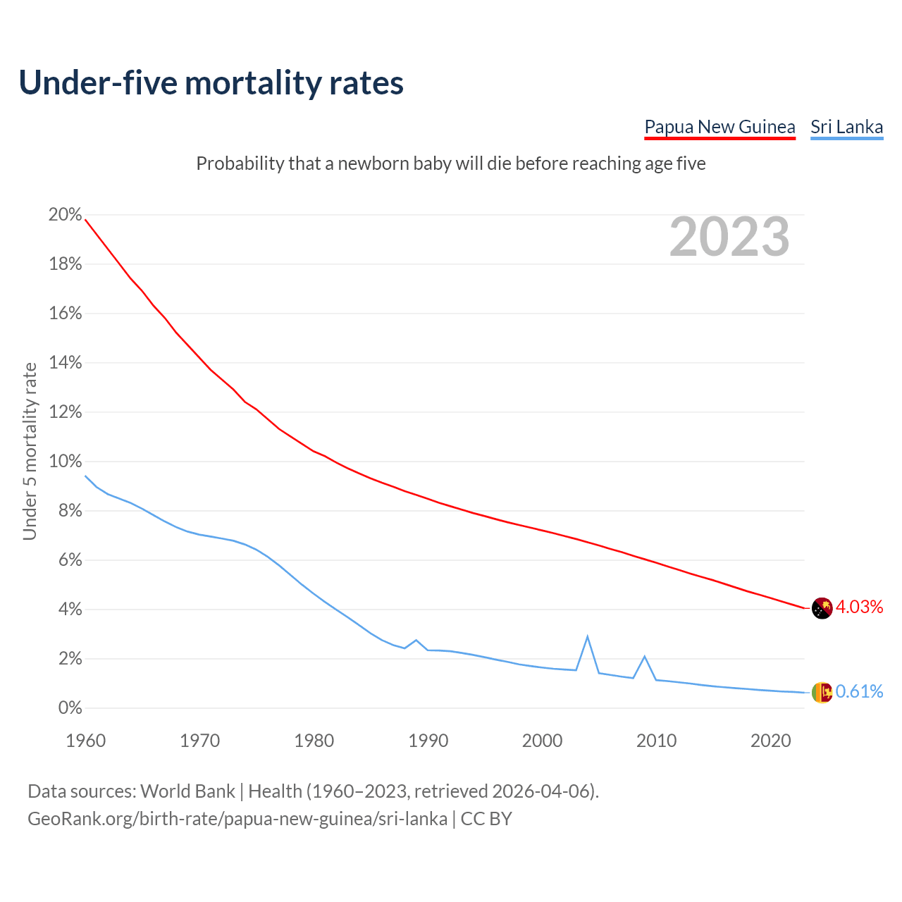 The chance that a newborn baby will die before reaching age five is 4.03% in Papua New Guinea and 0.61% in Sri Lanka. Above is a chart with historical data on under-five mortality rates.