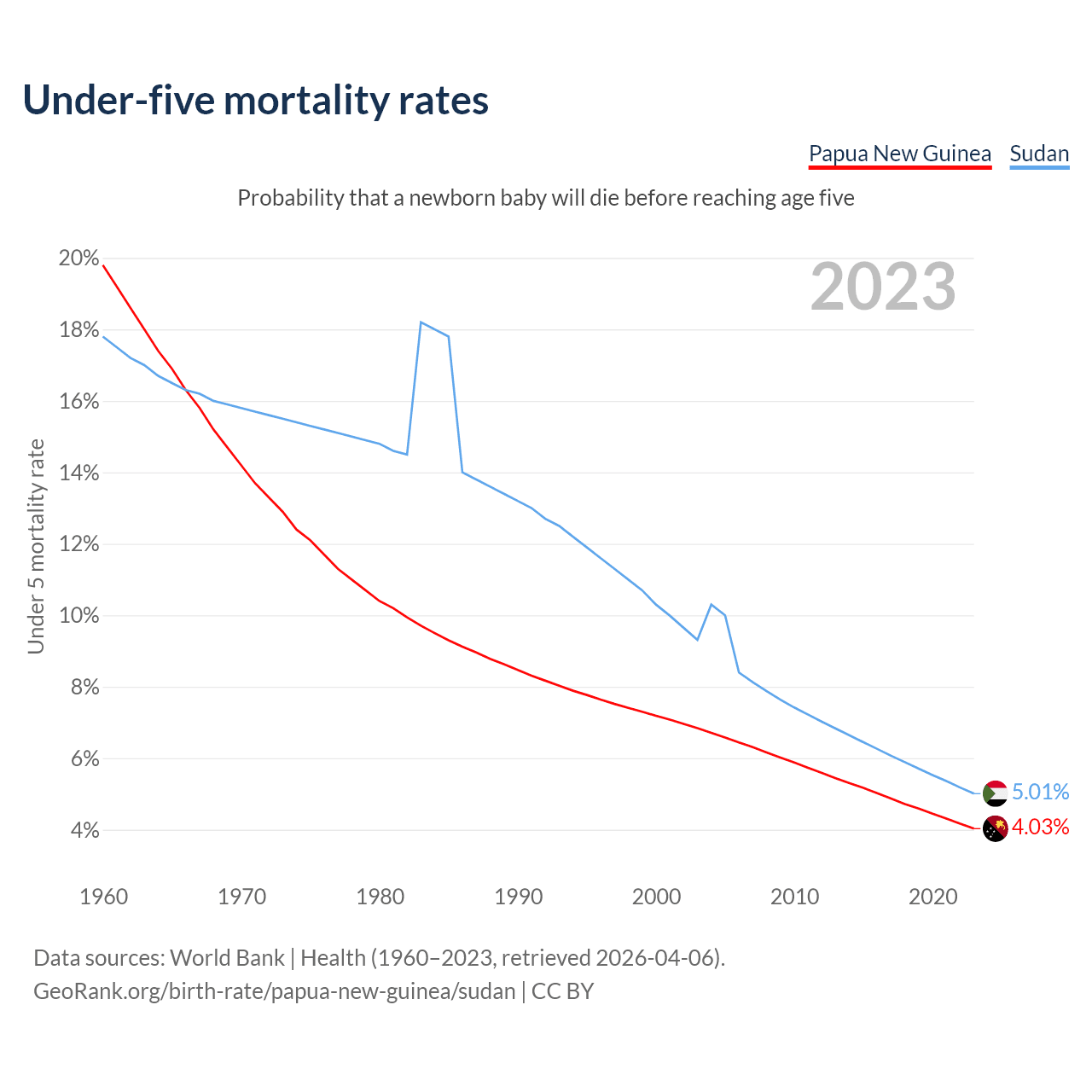 The chance that a newborn baby will die before reaching age five is 4.03% in Papua New Guinea and 5.01% in Sudan. Above is a chart with historical data on under-five mortality rates.
