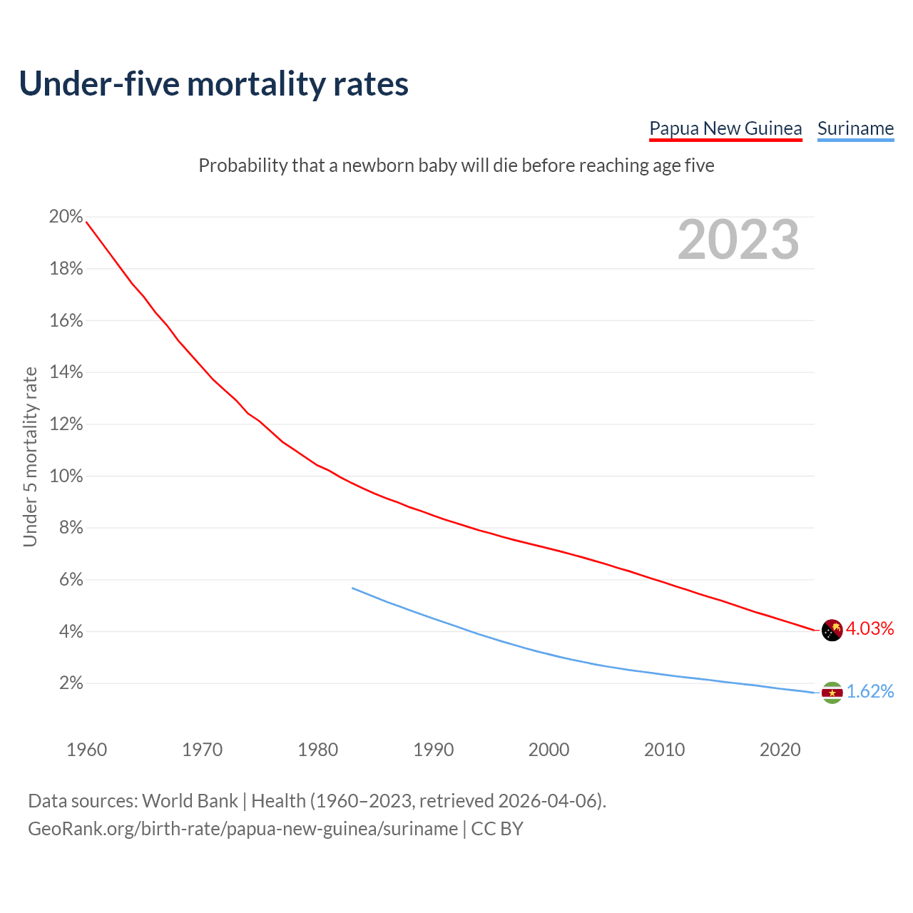 The chance that a newborn baby will die before reaching age five is 4.03% in Papua New Guinea and 1.62% in Suriname. Above is a chart with historical data on under-five mortality rates.