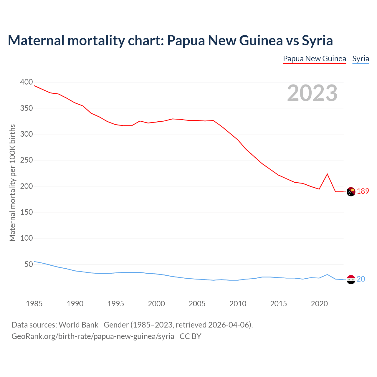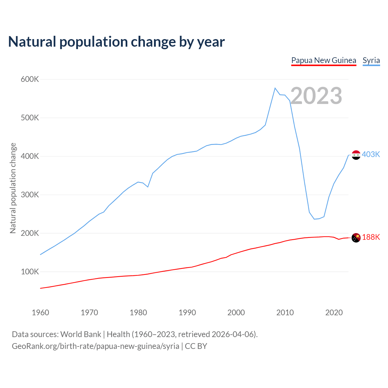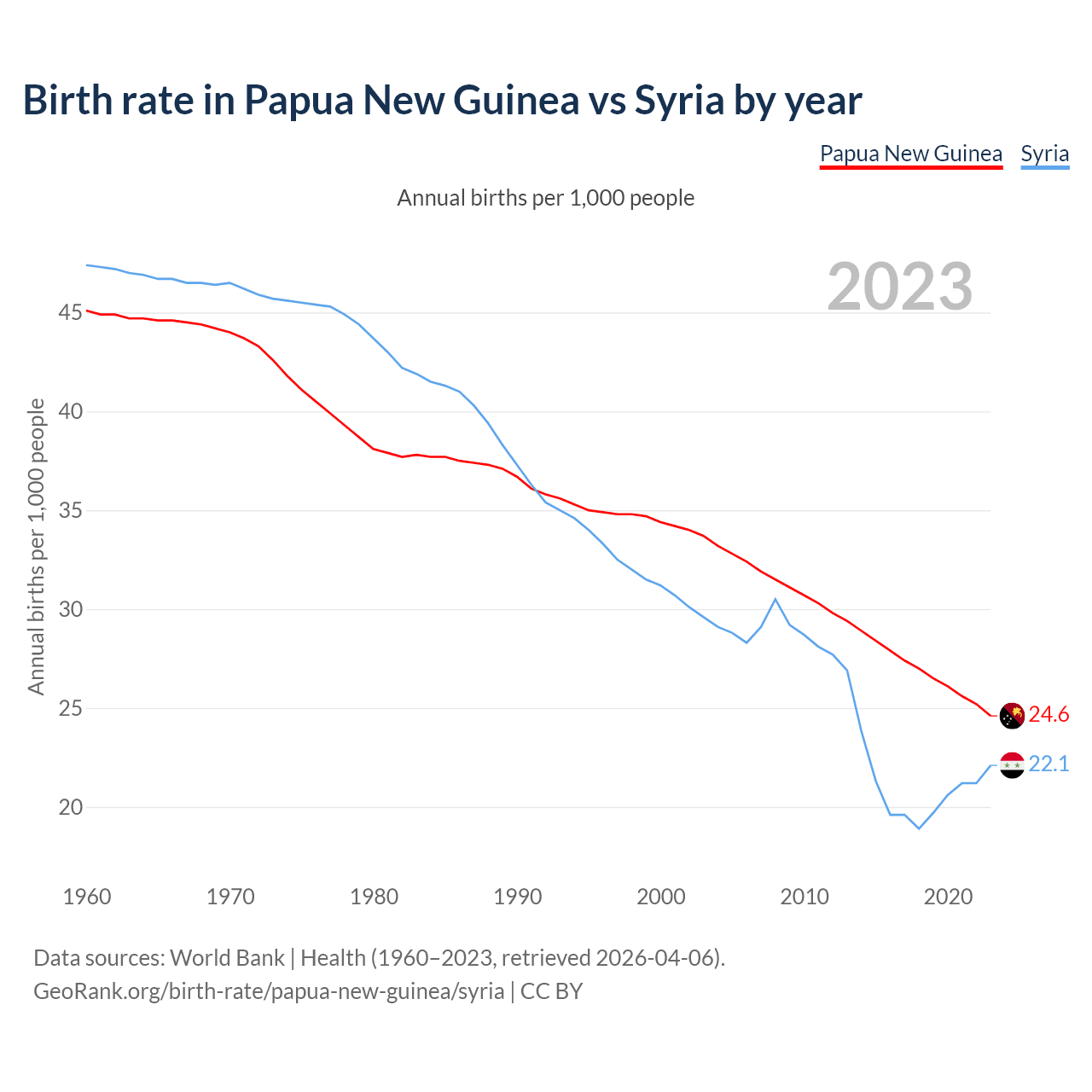 Papua New Guinea has an annual birth rate of 24.6 births per 1,000 people, compared to 22.1 for Syria. The average number of children a woman is expected to have during her lifetime — the fertility rate, is 3.1 in Papua New Guinea and 2.71 in Syria — 12.5% difference.