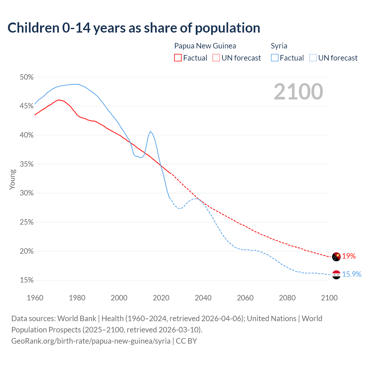 According to the latest available data on birth rates, the fertility rate in Papua New Guinea was 3.1 children per woman in 2023, compared to 2.71 in Syria in 2023. The replacement level is considered to be 2.1 children per woman.