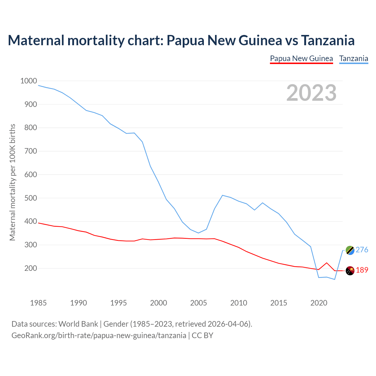 The maternal mortality rate, which is the probability of dying during childbirth or within 42 days of pregnancy termination, is 189 deaths per 100,000 live births in Papua New Guinea, compared to 276 deaths in Tanzania.