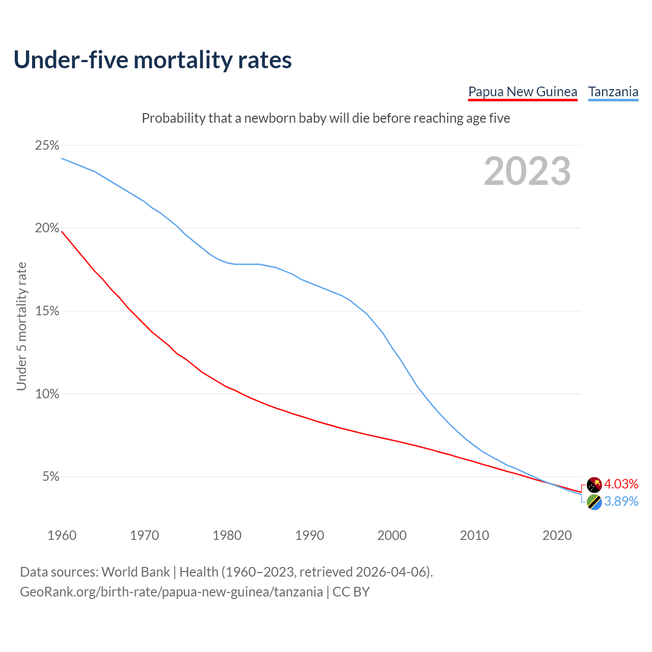 The chance that a newborn baby will die before reaching age five is 4.03% in Papua New Guinea and 3.89% in Tanzania. Above is a chart with historical data on under-five mortality rates.
