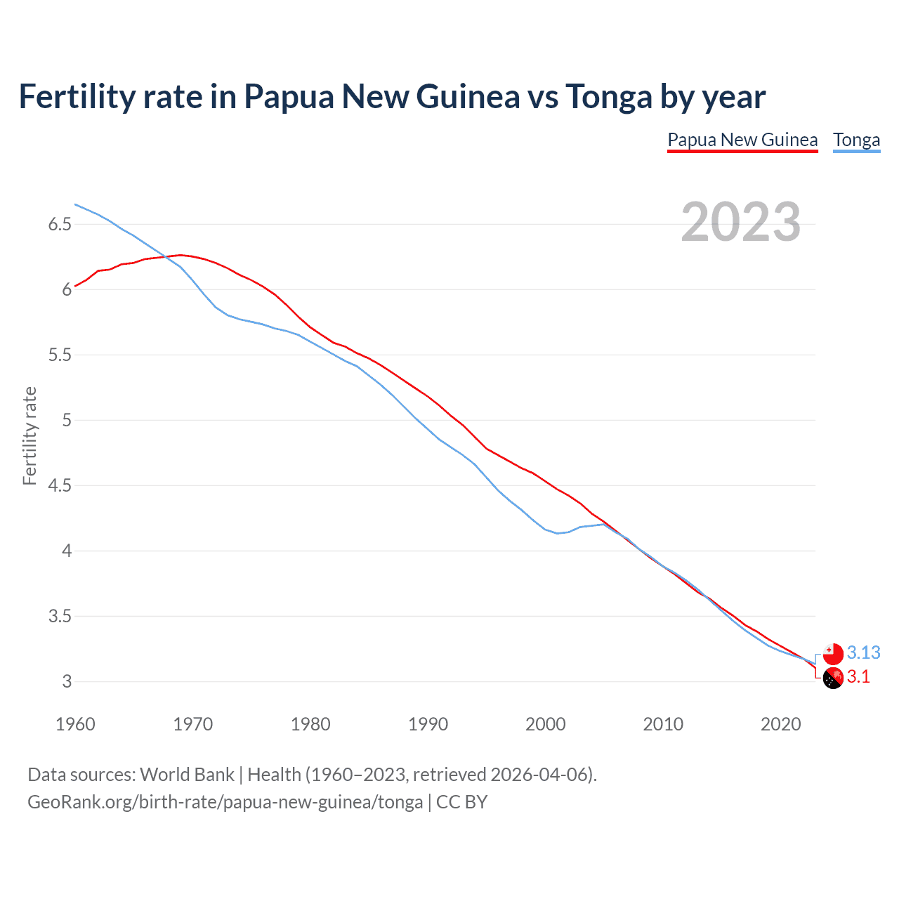 1960 vs 2023, the fertility rate has decreased by 48.5% in Papua New Guinea and by 53% in Tonga — in 1960, it was 6.02 and 6.65, respectively.