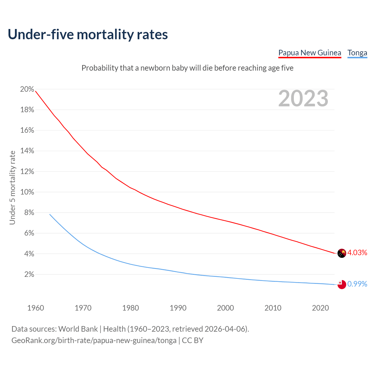 The chance that a newborn baby will die before reaching age five is 4.03% in Papua New Guinea and 0.99% in Tonga. Above is a chart with historical data on under-five mortality rates.