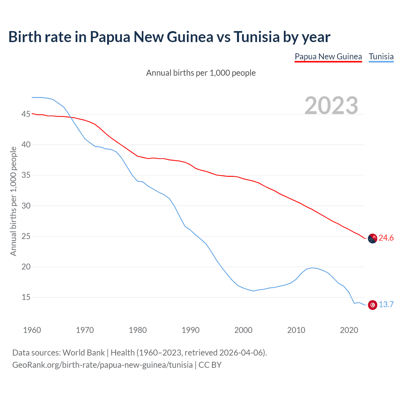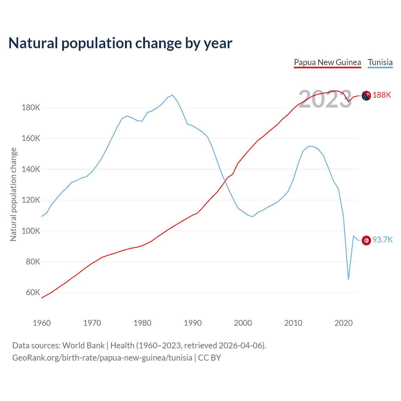 According to the latest available data on birth rates, the fertility rate in Papua New Guinea was 3.1 children per woman in 2023, compared to 1.83 in Tunisia in 2023. The replacement level is considered to be 2.1 children per woman.