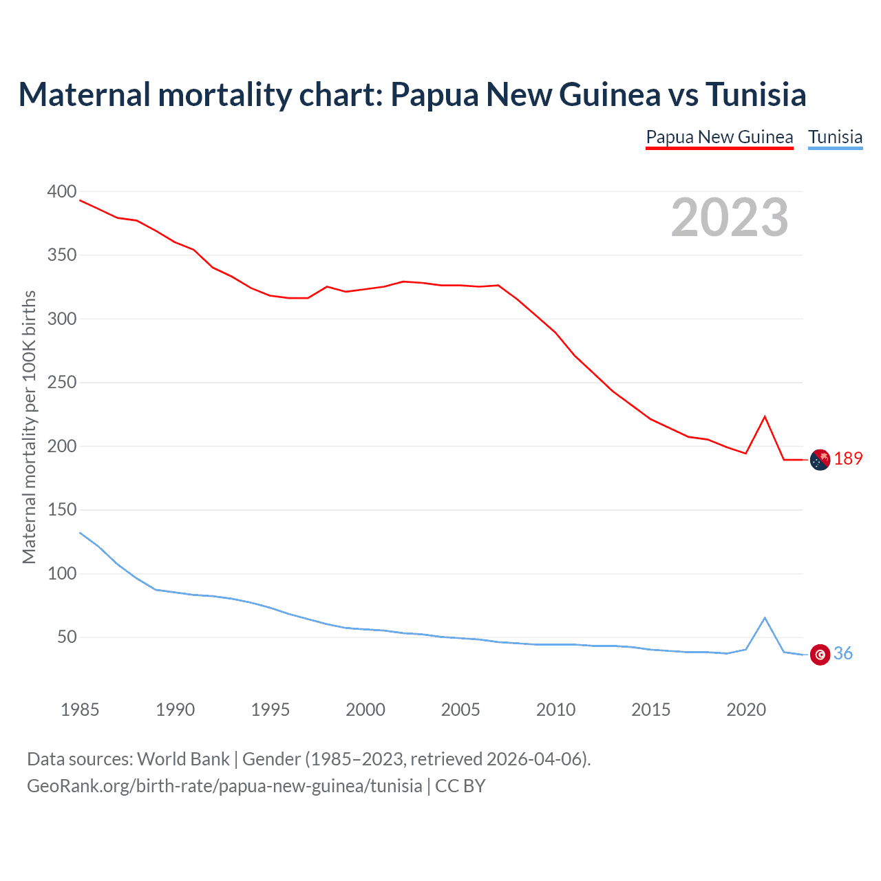 The maternal mortality rate, which is the probability of dying during childbirth or within 42 days of pregnancy termination, is 189 deaths per 100,000 live births in Papua New Guinea, compared to 36 deaths in Tunisia.