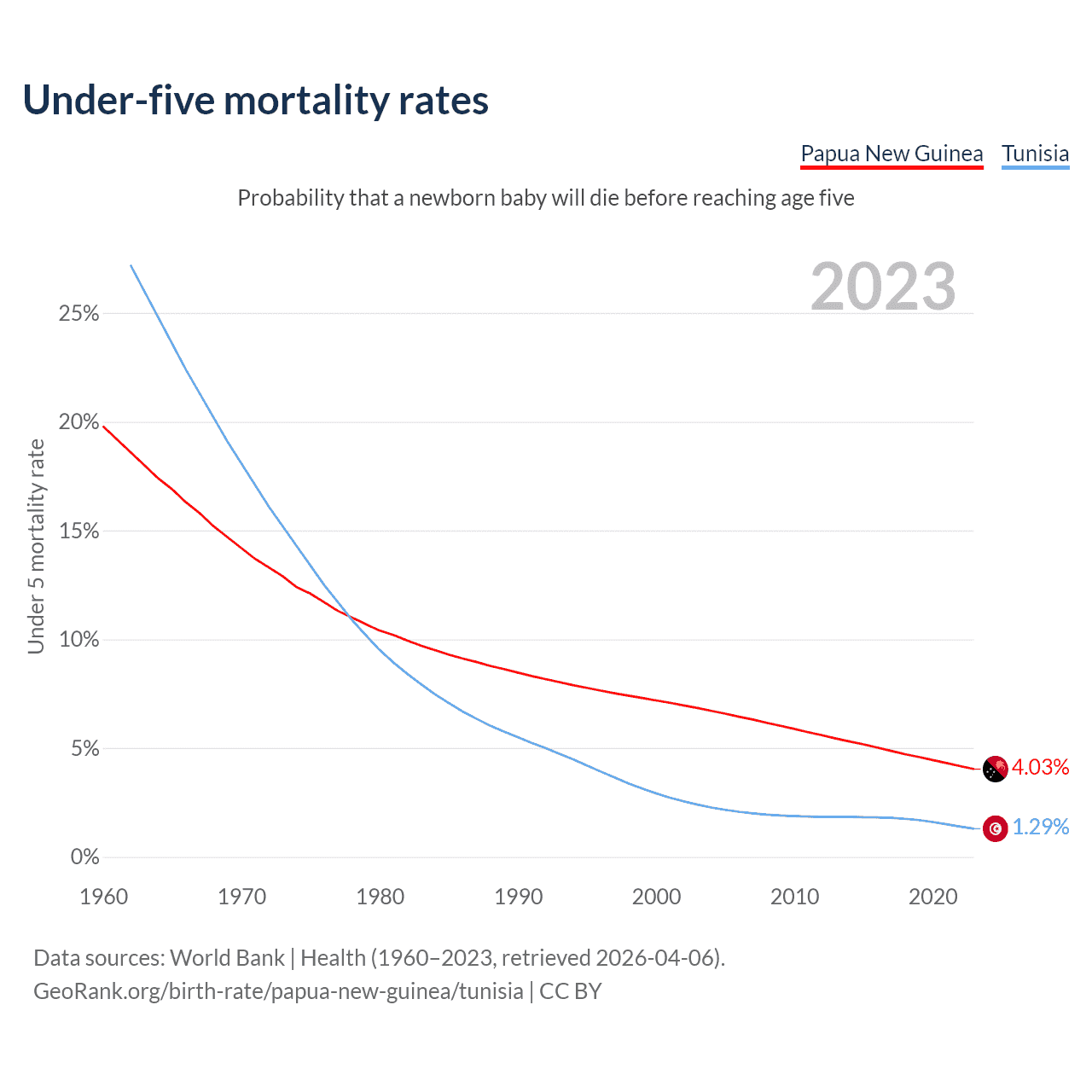 The chance that a newborn baby will die before reaching age five is 4.03% in Papua New Guinea and 1.29% in Tunisia. Above is a chart with historical data on under-five mortality rates.