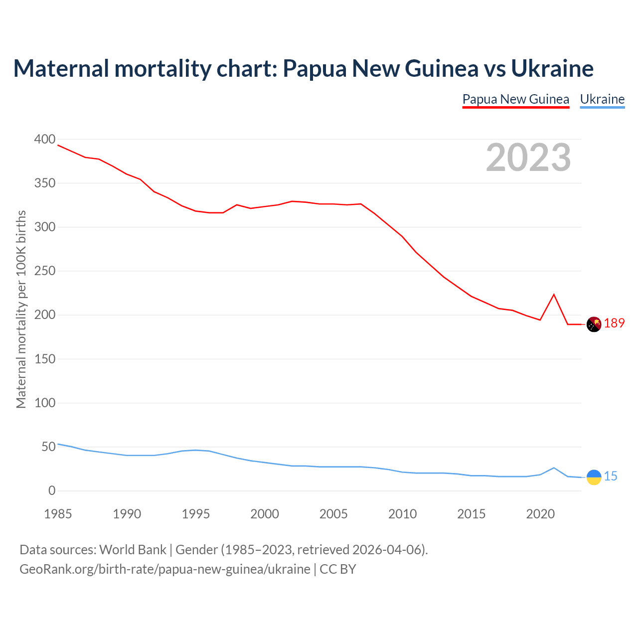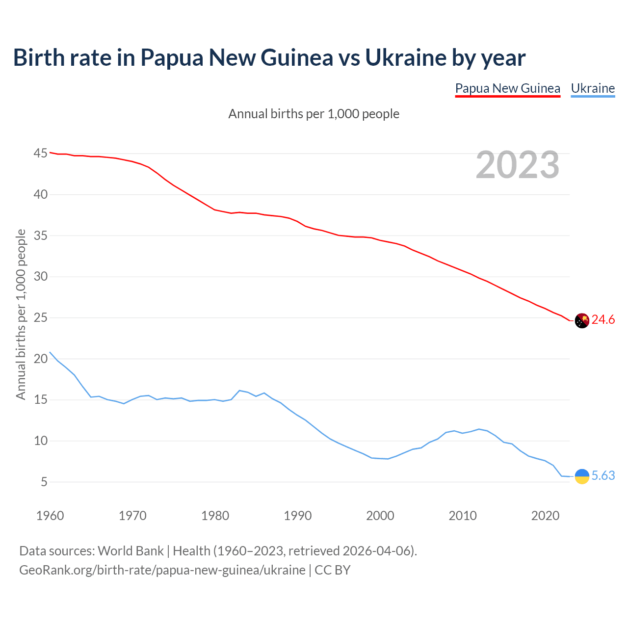 Papua New Guinea has an annual birth rate of 24.6 births per 1,000 people, compared to 5.63 for Ukraine. The average number of children a woman is expected to have during her lifetime — the fertility rate, is 3.1 in Papua New Guinea and 0.98 in Ukraine — 68.5% difference.