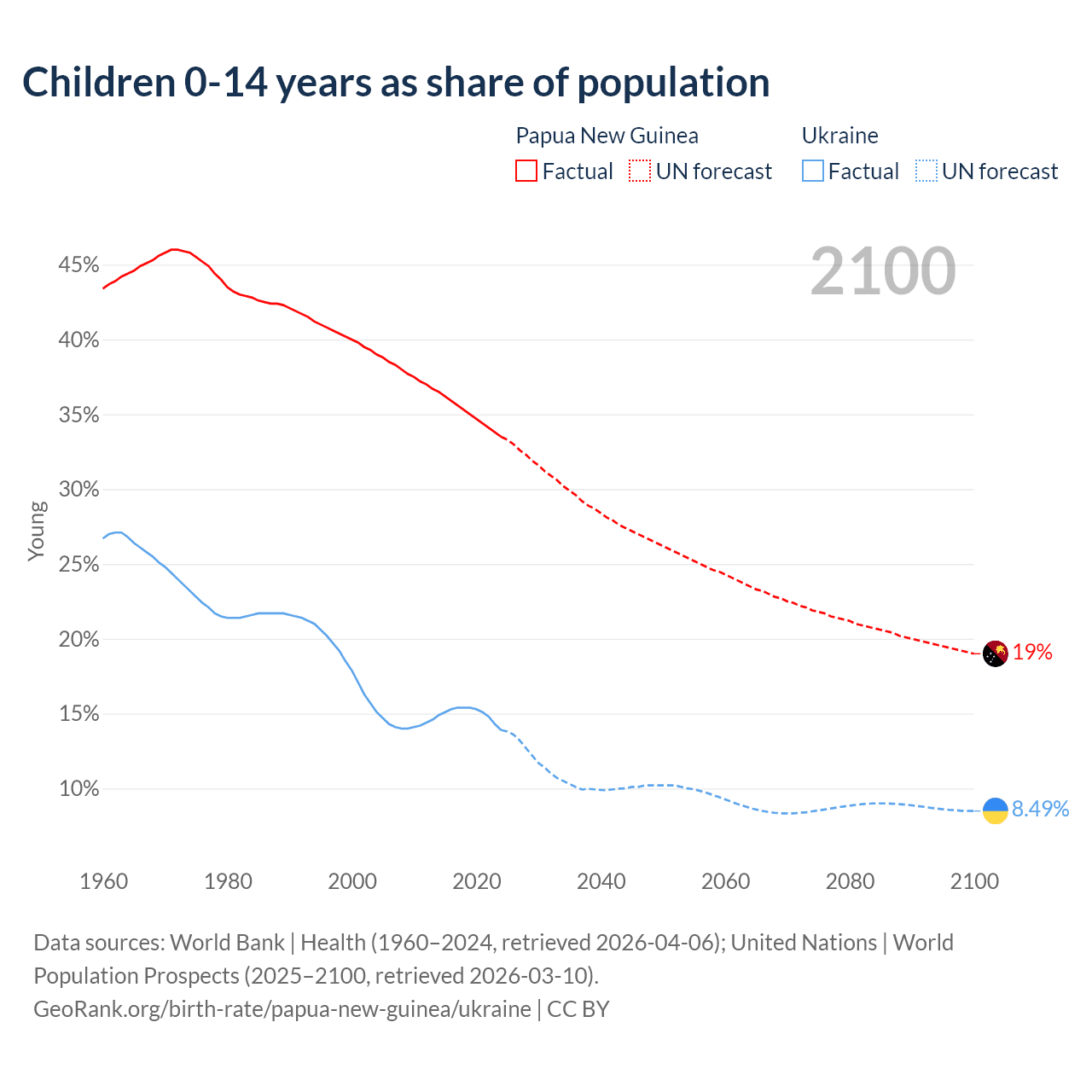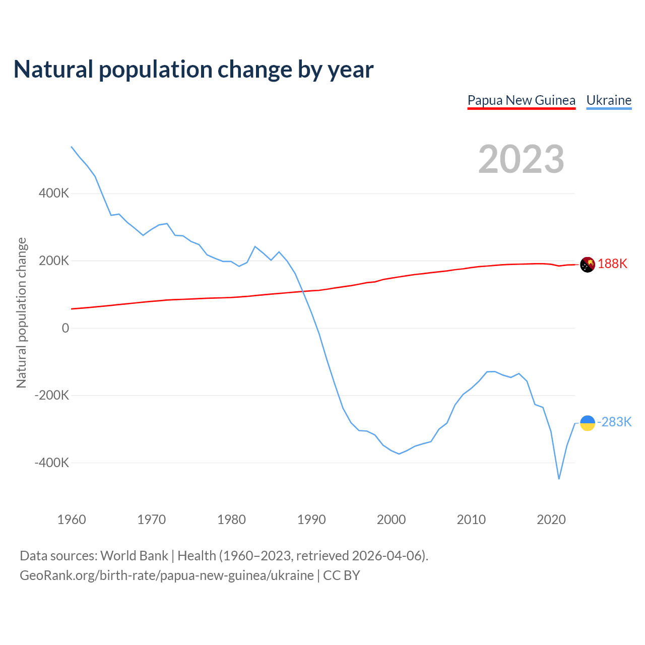According to the latest available data on birth rates, the fertility rate in Papua New Guinea was 3.1 children per woman in 2023, compared to 0.98 in Ukraine in 2023. The replacement level is considered to be 2.1 children per woman.