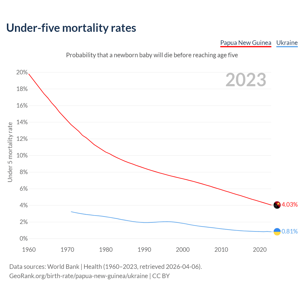 The chance that a newborn baby will die before reaching age five is 4.03% in Papua New Guinea and 0.81% in Ukraine. Above is a chart with historical data on under-five mortality rates.