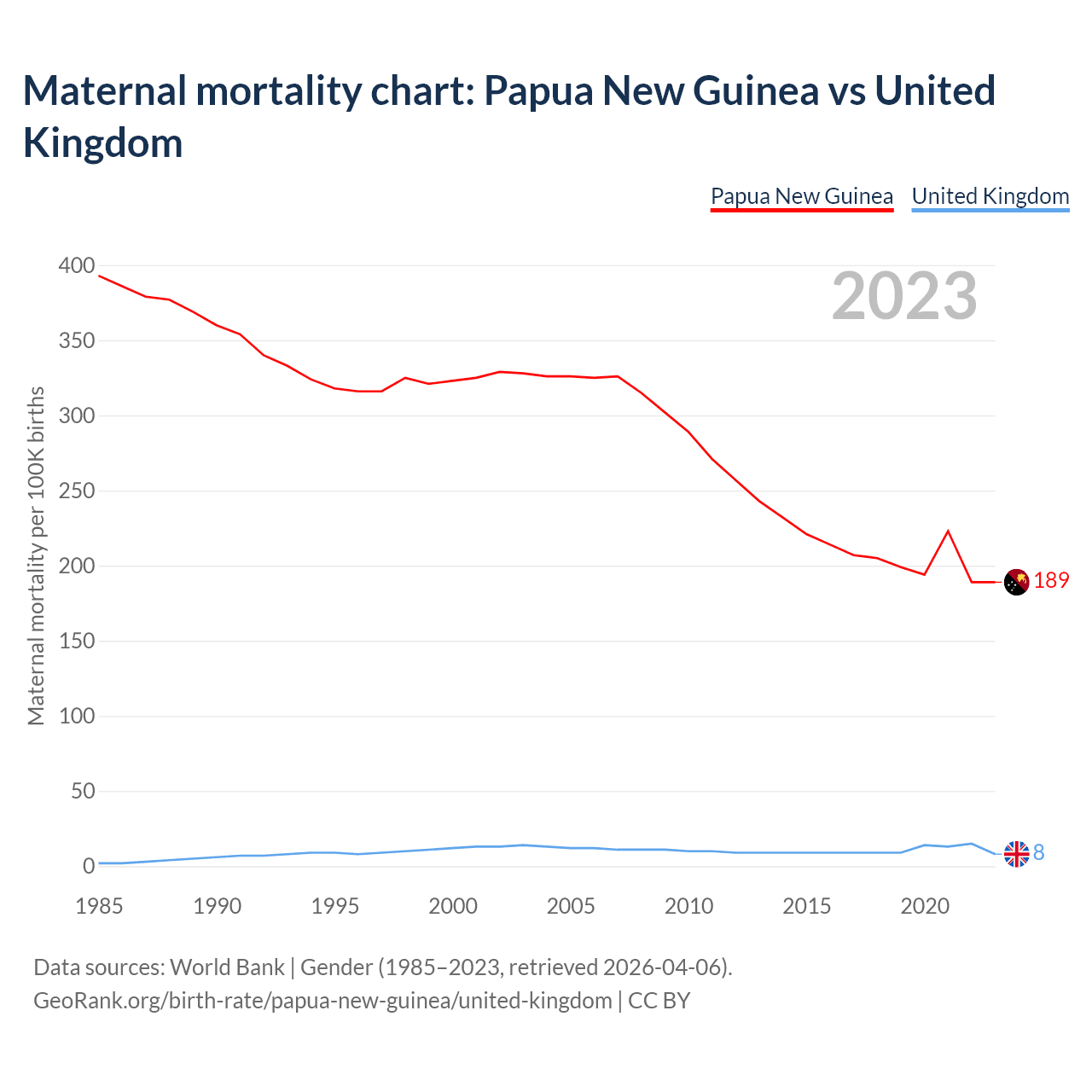 The maternal mortality rate, which is the probability of dying during childbirth or within 42 days of pregnancy termination, is 189 deaths per 100,000 live births in Papua New Guinea, compared to 8 deaths in the United Kingdom.