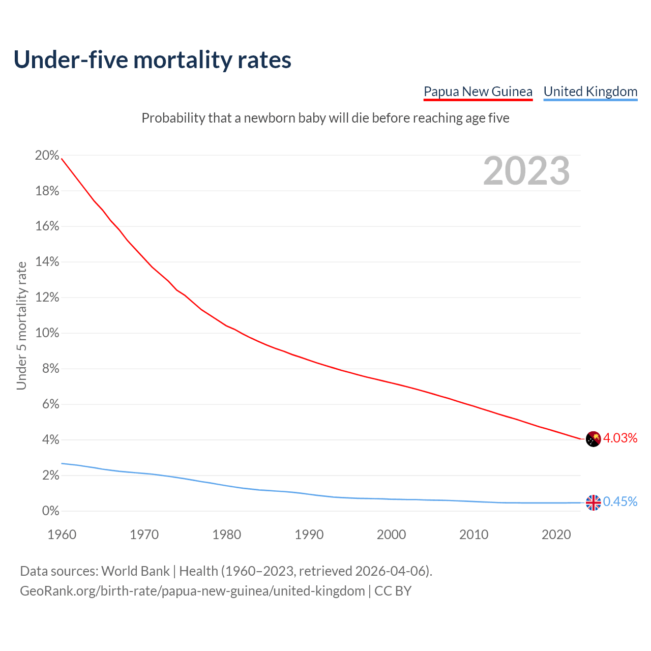 The chance that a newborn baby will die before reaching age five is 4.03% in Papua New Guinea and 0.45% in the United Kingdom. Above is a chart with historical data on under-five mortality rates.