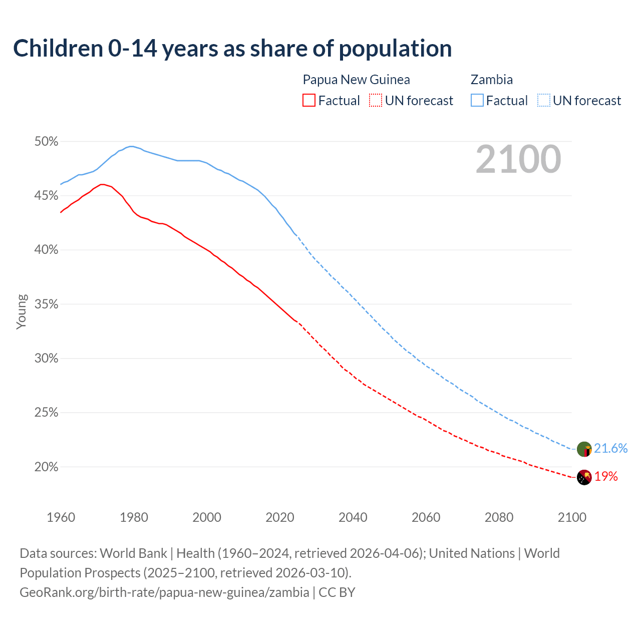 According to the latest available data on birth rates, the fertility rate in Papua New Guinea was 3.1 children per woman in 2023, compared to 4.1 in Zambia in 2023. The replacement level is considered to be 2.1 children per woman.