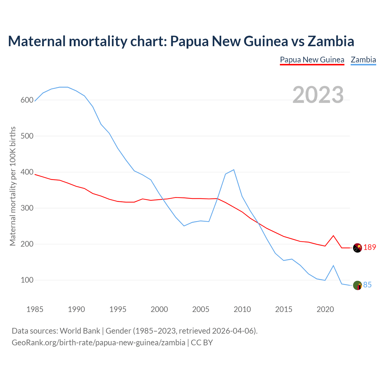 The maternal mortality rate, which is the probability of dying during childbirth or within 42 days of pregnancy termination, is 189 deaths per 100,000 live births in Papua New Guinea, compared to 85 deaths in Zambia.