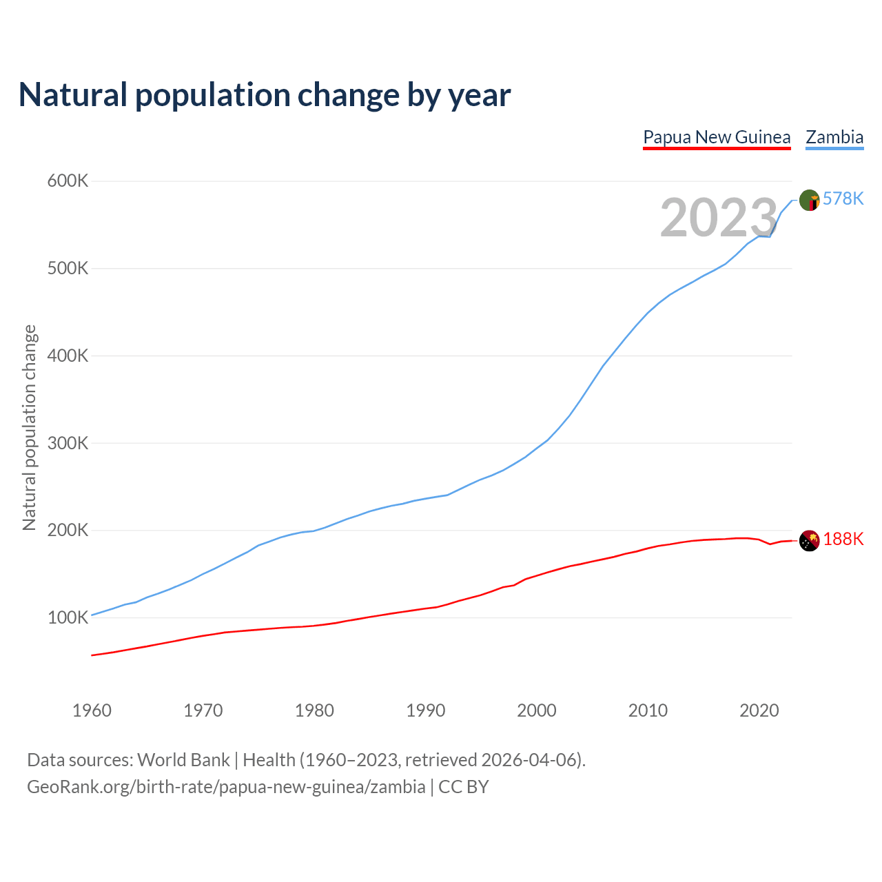 Papua New Guinea has an annual birth rate of 24.6 births per 1,000 people, compared to 33.1 for Zambia. The average number of children a woman is expected to have during her lifetime — the fertility rate, is 3.1 in Papua New Guinea and 4.1 in Zambia — 32.3% difference.