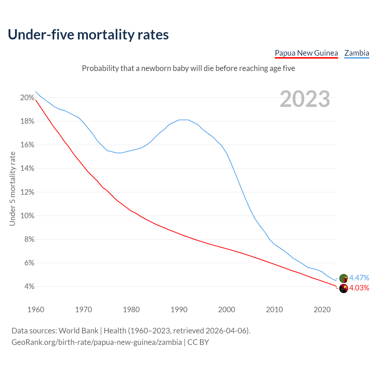 The chance that a newborn baby will die before reaching age five is 4.03% in Papua New Guinea and 4.47% in Zambia. Above is a chart with historical data on under-five mortality rates.