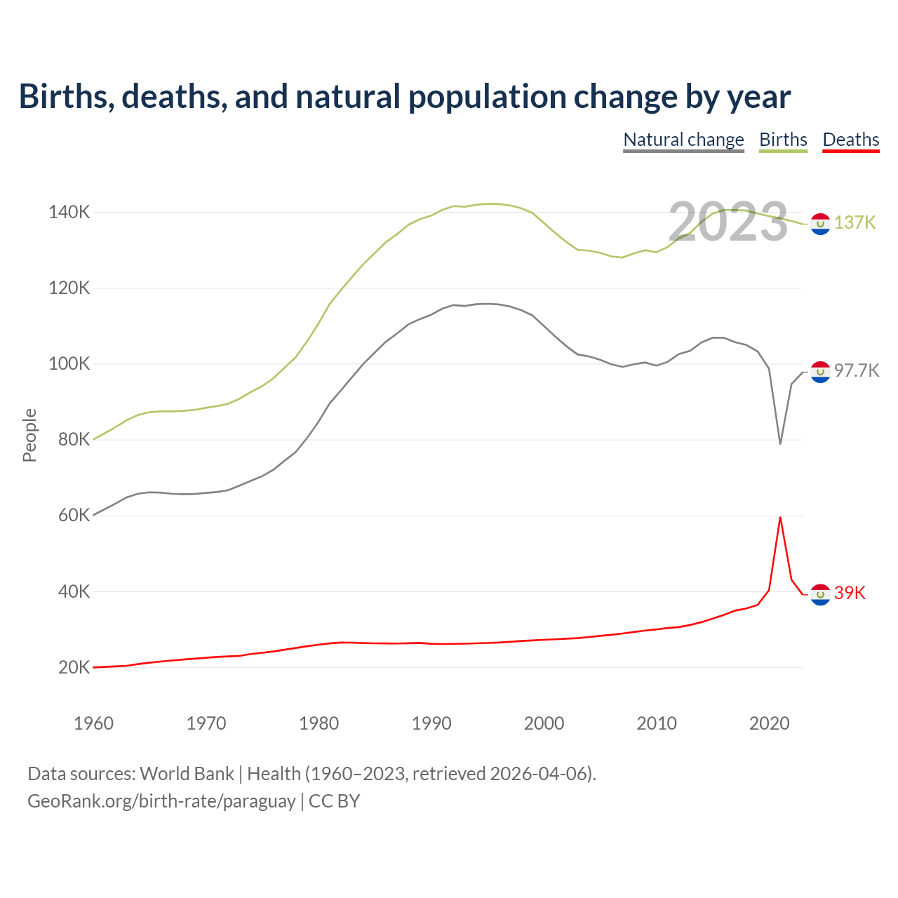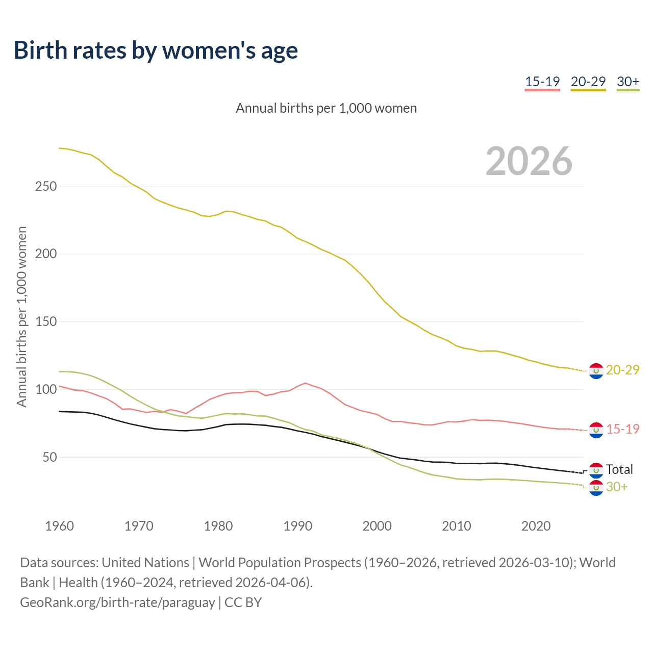 Paraguay has a birth rate of 20 (annual births per 1,000 people) and a fertility rate of 2.42 (the average number of children a woman is expected to have over her lifetime based on current age-specific birth rates).