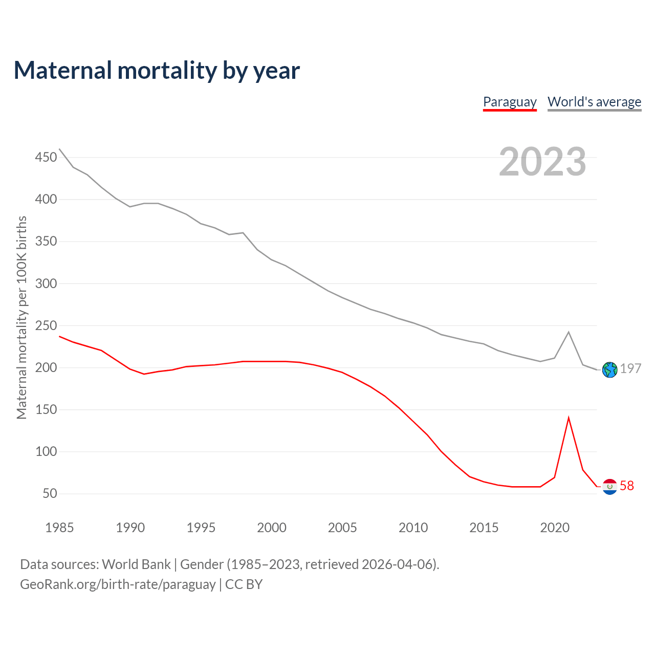 The maternal mortality rate in Paraguay was 58 deaths per 100,000 live births in 2023 — a 0.06% chance of dying during childbirth or within 42 days of pregnancy termination. This is a 72% decrease compared to the year 2000.