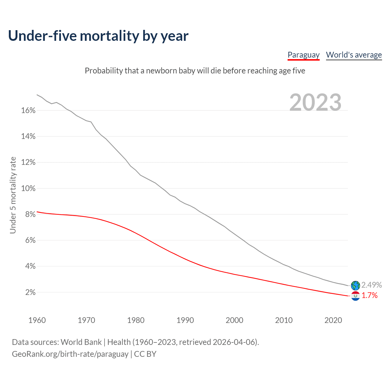 The under-5 mortality rate in Paraguay was 17 deaths per 1,000 live births in 2023 — a 1.7% chance that a newborn baby will die before reaching age five. This is down from 33.6 deaths per 1,000 live births in 2000.