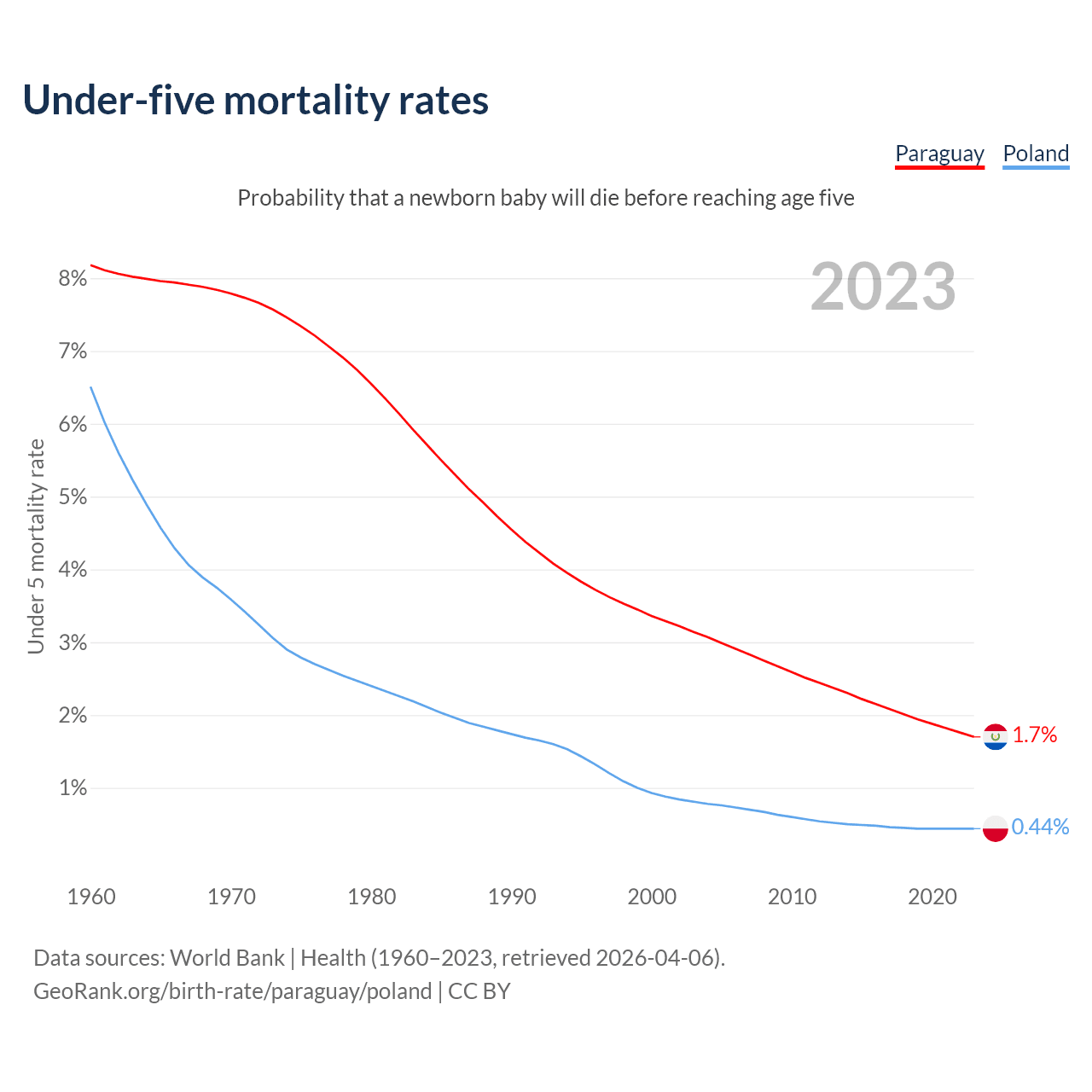 The chance that a newborn baby will die before reaching age five is 1.7% in Paraguay and 0.44% in Poland. Above is a chart with historical data on under-five mortality rates.