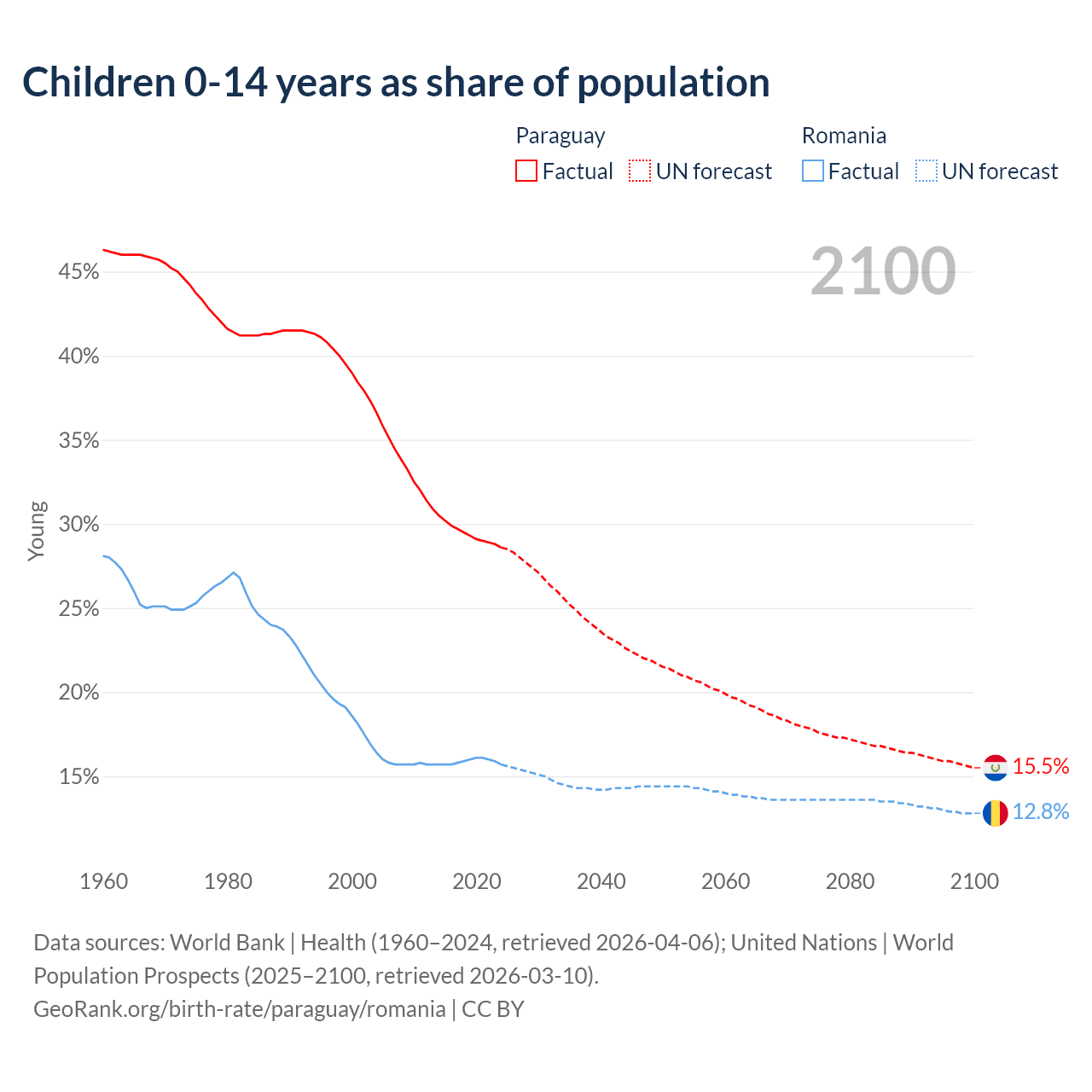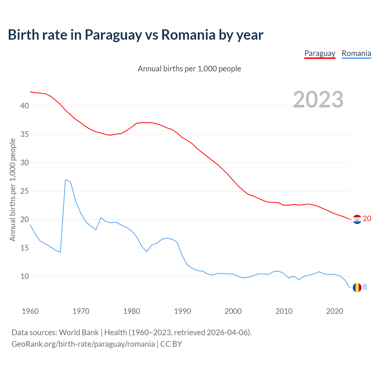 Paraguay has an annual birth rate of 20 births per 1,000 people, compared to 8 for Romania. The average number of children a woman is expected to have during her lifetime — the fertility rate, is 2.42 in Paraguay and 1.71 in Romania — 29.4% difference.