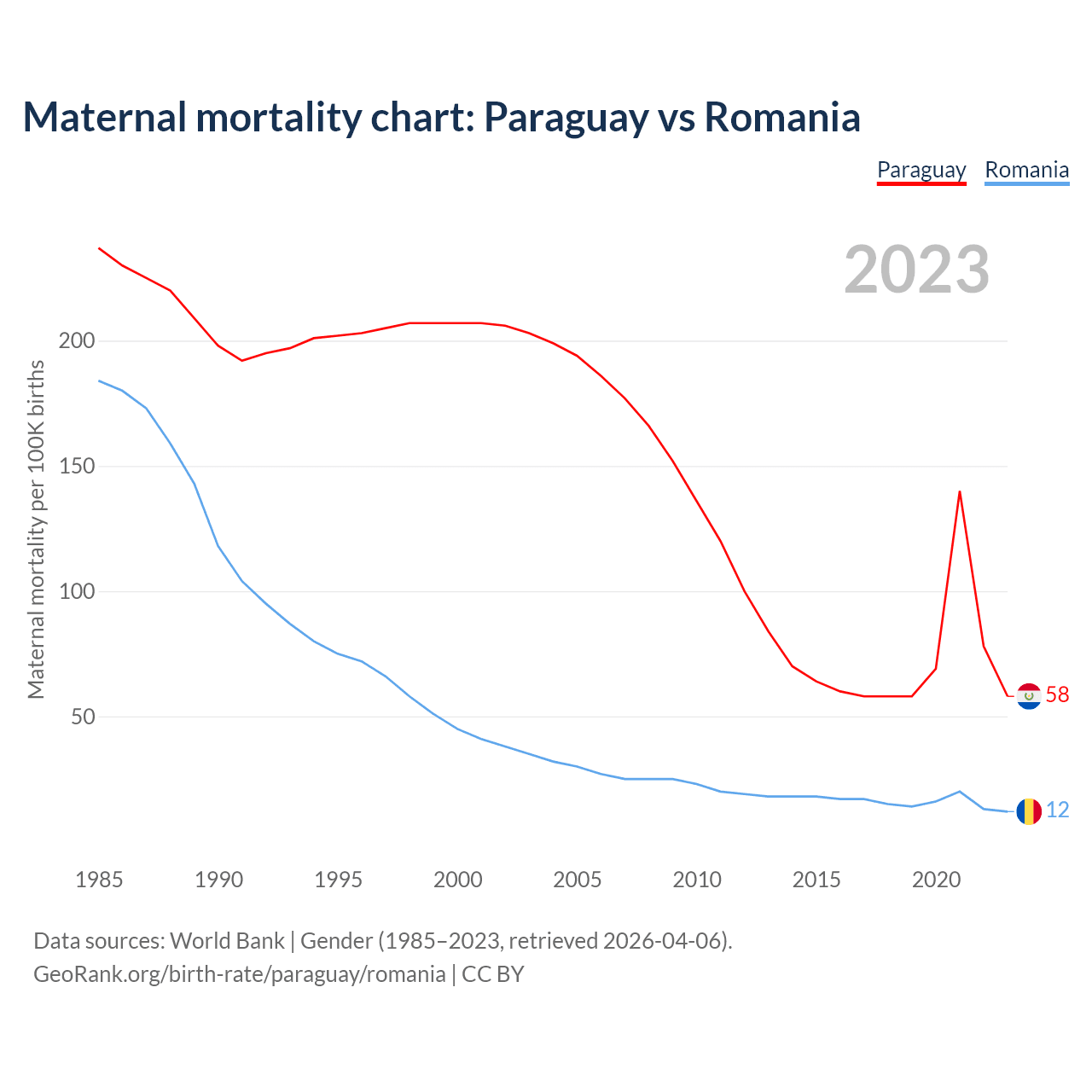The maternal mortality rate, which is the probability of dying during childbirth or within 42 days of pregnancy termination, is 58 deaths per 100,000 live births in Paraguay, compared to 12 deaths in Romania.