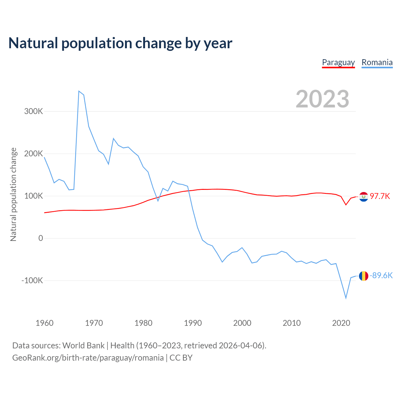 According to the latest available data on birth rates, the fertility rate in Paraguay was 2.42 children per woman in 2023, compared to 1.71 in Romania in 2023. The replacement level is considered to be 2.1 children per woman.