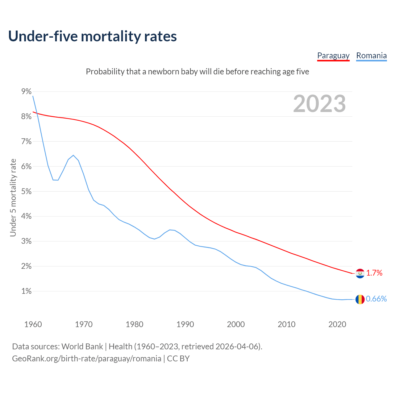 The chance that a newborn baby will die before reaching age five is 1.7% in Paraguay and 0.66% in Romania. Above is a chart with historical data on under-five mortality rates.