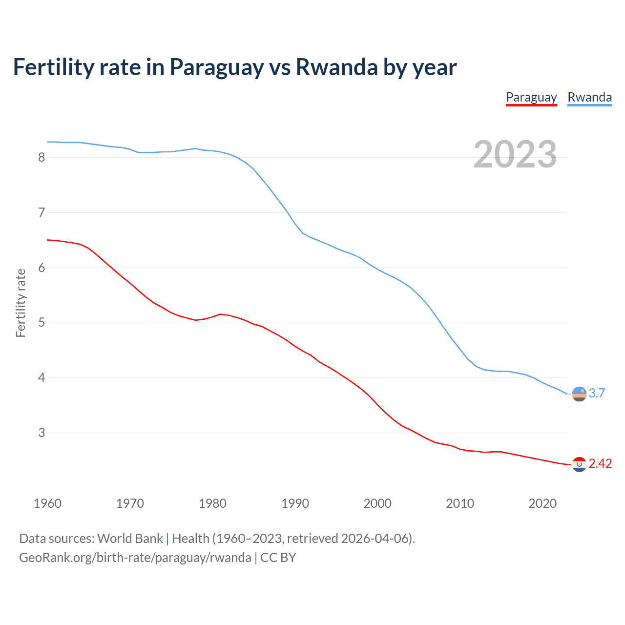 1960 vs 2023, the fertility rate has decreased by 62.7% in Paraguay and by 55.4% in Rwanda — in 1960, it was 6.5 and 8.28, respectively.